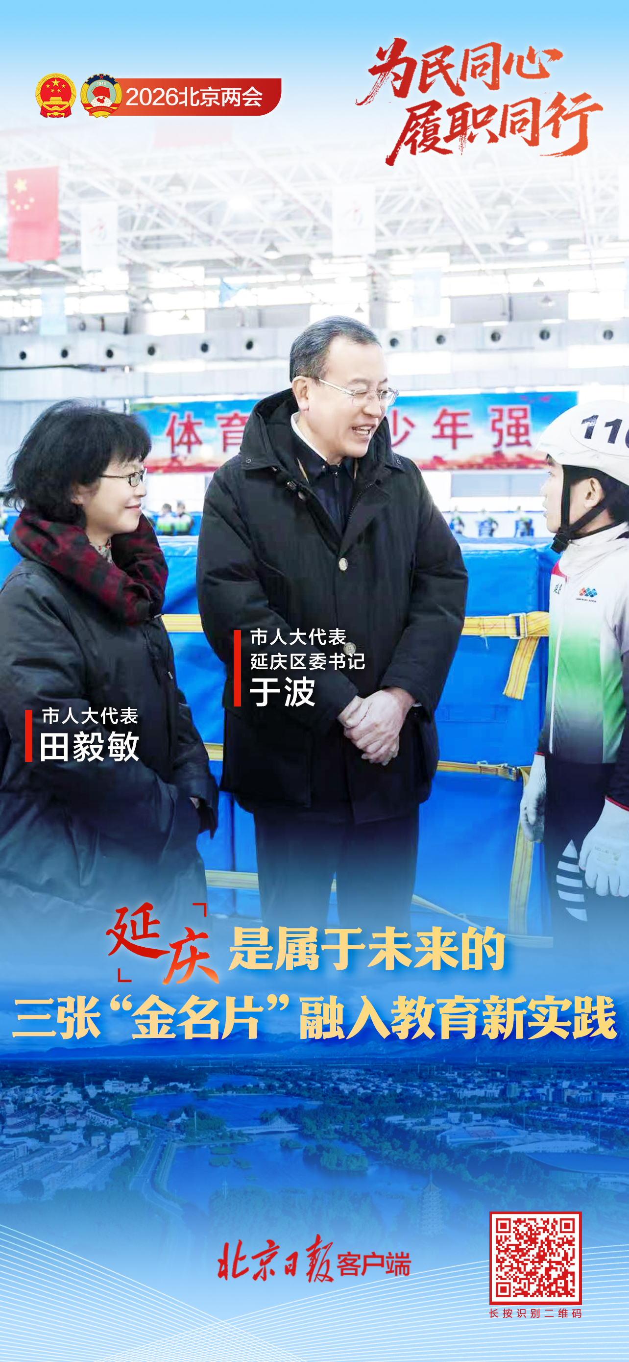 2026年北京市两会前夕,围绕市人大代表田毅敏提出的“推进延庆教育高质量发展”建议,于波邀请田毅敏走进延庆区第二小学双师课堂、童心长城博物馆和梦起源滑冰馆,实地感受延庆教育高质量发展的成果。