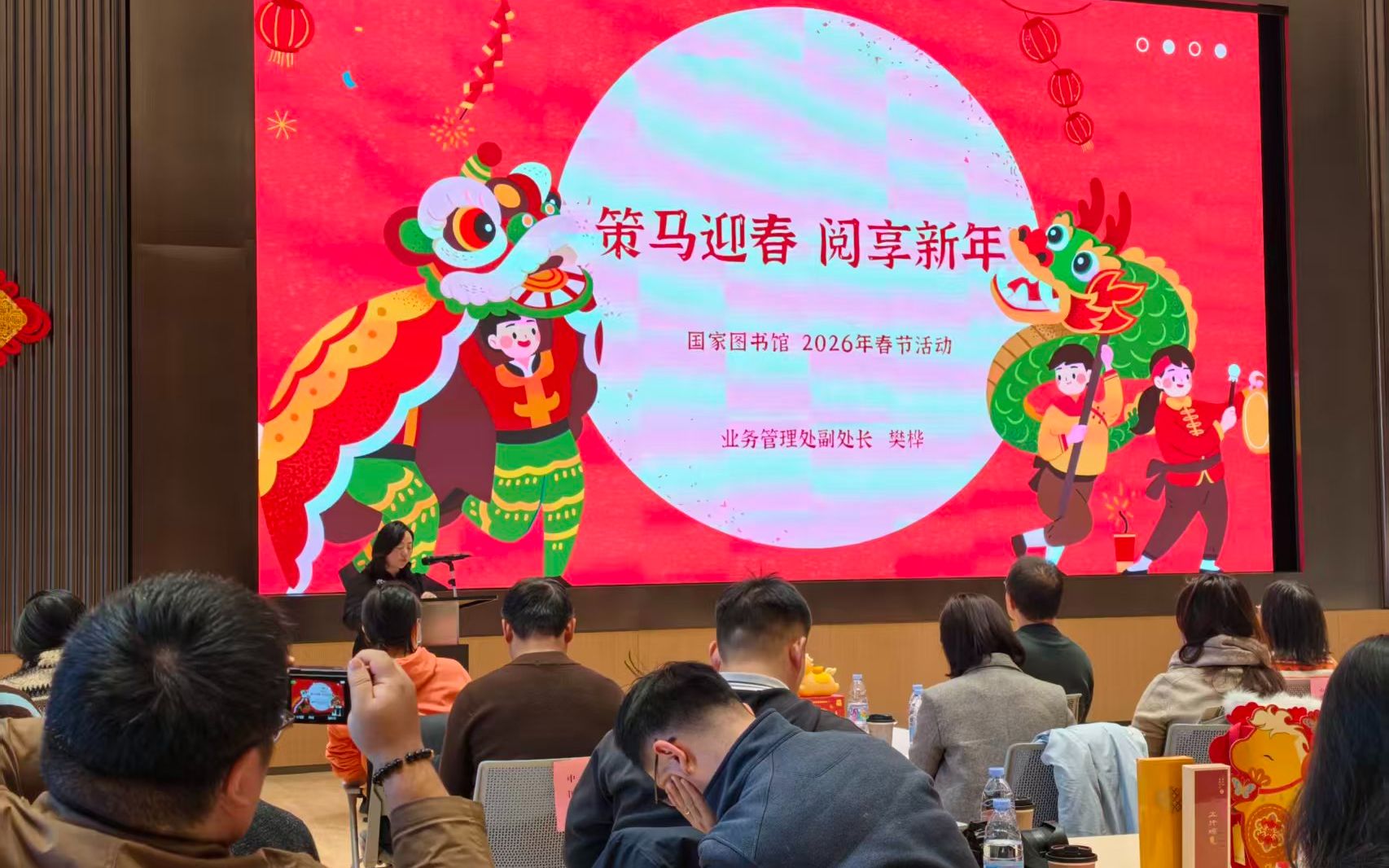 2月上旬,由国家图书馆与中国图书馆学会联合发起的业界联动活动项目——“策马迎春 阅享新年”春节主题活动将正式启动。国家图书馆通过整合年俗文化资源,推出中国年俗文化活动春节资源礼包,内容包括年俗展览、年俗古籍、特色讲座、特别活动等数字资源。中国图书馆学会组织动员全国各类各级图书馆及有关单位参与联动,预计全国将有1000余家单位共同参与。全国读者将通过线上线下共享春节文化大礼包,共度美好佳节。