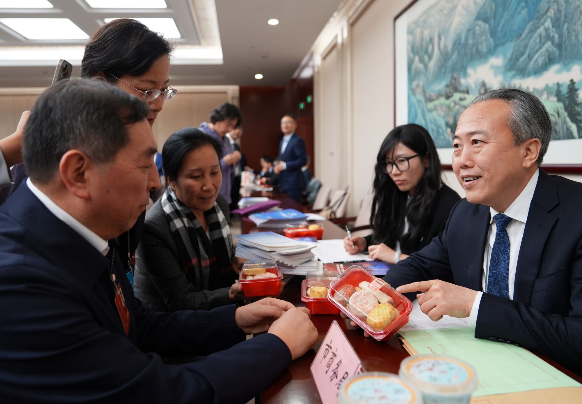 北京市规划和自然资源委员会“摊位”上摆着润喉药片,供询问和咨询的代表委员取用。北京市商务局的“摊位”上,现场展示了多款兼具年味与创意的老字号及跨界产品,如奶皮酸奶、麻酱素毛肚等。