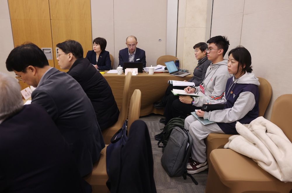 1月24日下午,北京市政协十四届四次会议举行分组讨论,委员们围绕市政协常委会工作报告和提案工作报告进行讨论。图为青少年“模拟政协”观摩团团员牛栏山一中王梓伊和北京市平谷中学齐芯列席教育界别分组讨论。