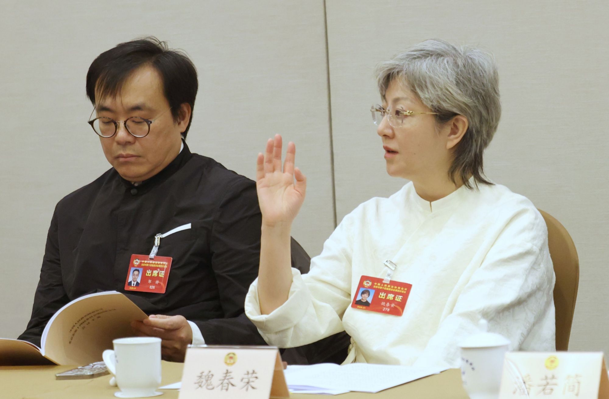 文艺界别分组讨论,市政协委员魏春荣举手发言。