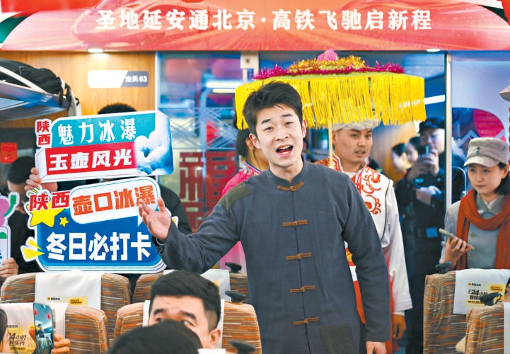 1月26日,演员在延安开往北京的G359次列车上为旅客演唱陕北民歌。新华社记者 李一博 摄