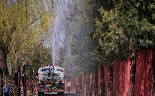 ▲2025年3月19日,北京红领巾公园,工作人员对路侧的圆柏洒水喷淋,以减少花粉飘散量。新京报记者 薛珺 摄