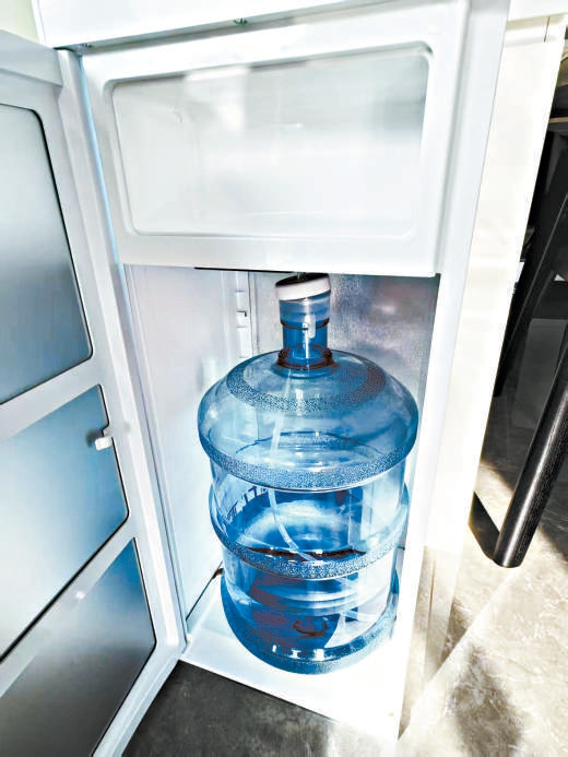 当日上午,记者敲开另一户居民家的门。“你看我们家的这洗手台,无论是台面还是水管上,水一溅到就白花花一片,钢丝球都擦不掉。”该位居民告诉记者,前两天她才拆开花洒清除水垢,可仅两天花洒内又有水垢沉积,“洗澡洗脸都别扭,更别说饮用了。”记者观察到这位年轻居民家厨房岛台旁放着桶装水,“这个桶装水也只用来喝。吃饭一般会点外卖,或者出去找餐馆。”