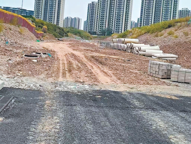 站在九里熙宸小区内的高处俯视,西边有一条新修的柏油路,遇到一片高坡时,柏油路戛然而止,连接的是一片土路。出小区东门左转来到小区西侧,爬上高坡,记者发现该条柏油路南段、北段均已修好,只留中间一段未能铺设。居民说:“这条道路下方埋的供水管线能直接供应市政水,道路修好后,供水管线就能启用,大家就能喝上市政水了。可这条道路修修停停,也影响大家喝上市政水。”