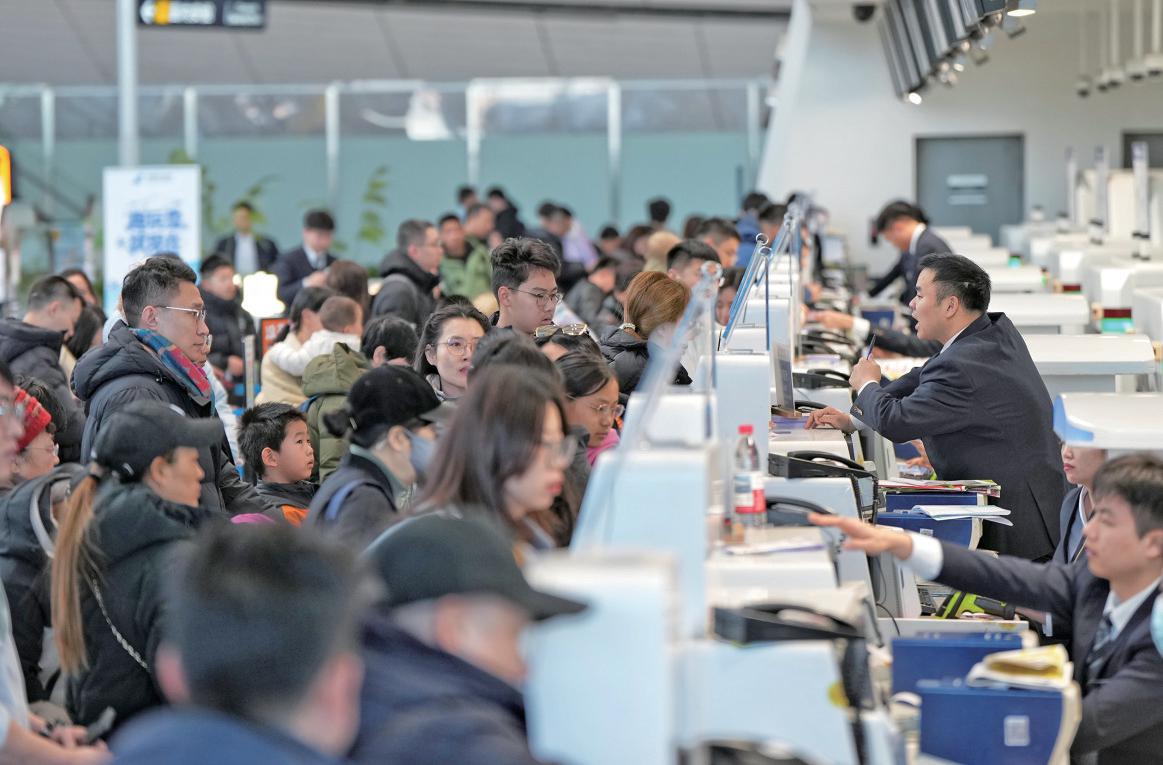 2月2日,北京大兴国际机场,旅客在柜台排队办理值机手续。新京报记者 陶冉 摄