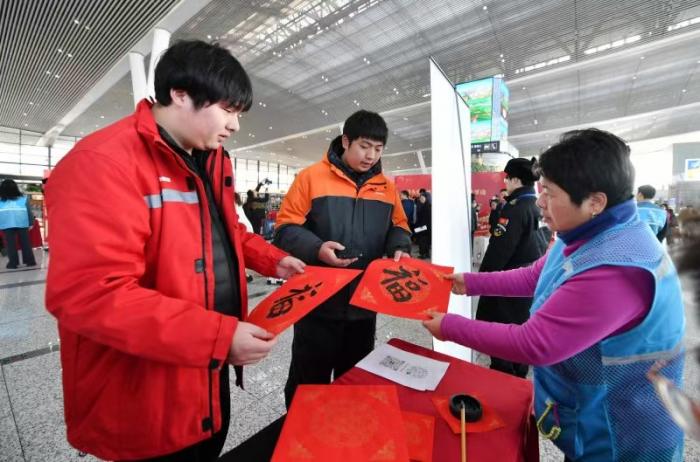 活动还设置了十余个志愿服务展台,涵盖立春节俗讲解、春联书写、非遗展示、全家福拍摄等内容。在“润笔送福”专区,书法爱好者与旅客共同书写福字与春联;“播种春天”专区发放“种子卡片”,普及农作物知识;“春日合拍”专区提供全家福拍摄服务,留下旅途温情瞬间。此外,交通、地震等部门志愿者也开展安全宣传,发放应急知识宣传品。