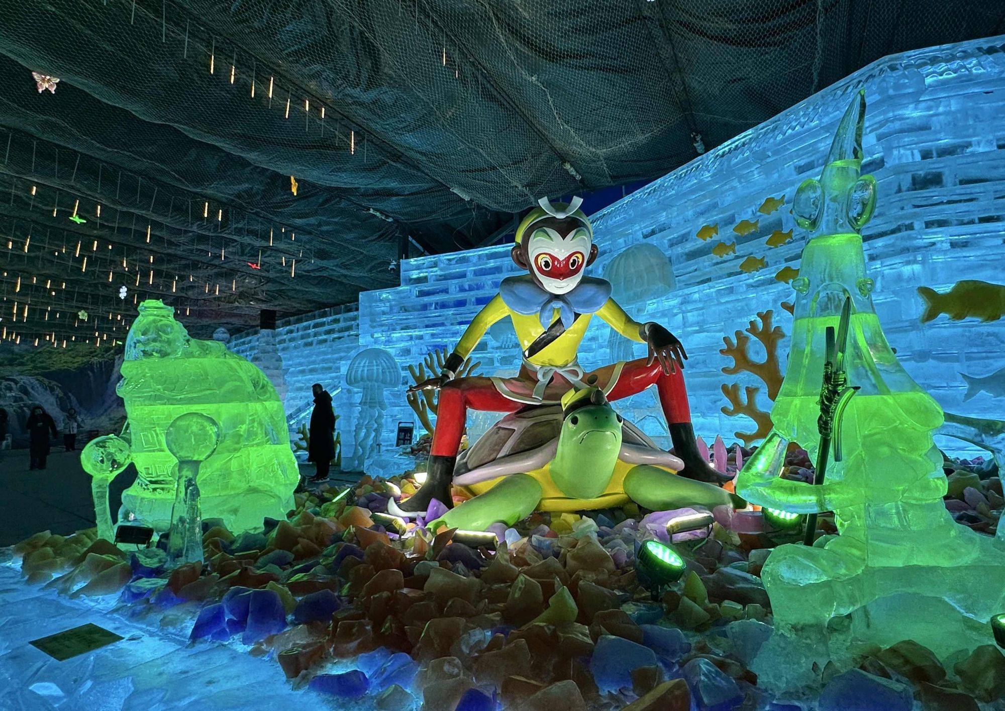 2月4日,新京报记者随“瓣瓣同心京津冀”集中采访活动来到延庆区。恰逢立春,北京城区气温回升,但龙庆峡夜间最低气温依旧接近零下10摄氏度,得天独厚的环境也为延庆打造冰雪项目提供了便利条件。今年冬天,龙庆峡冰灯与延庆世园非遗花灯首次双灯合璧,推出延庆“双灯会”,打造了全国独有的“冰灯+花灯”沉浸式体验场景。作为冬季文旅项目的突破性尝试,“双灯会”携手致敬动画片《大闹天宫》,打造统一IP下的差异化文旅体验,让游客一站式感受冰灯与花灯的双重魅力。
