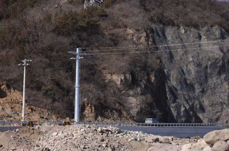 2月5日,密云区冯家峪镇冯西路旁新组立的钢管杆。密云地区39条受损线路全部恢复至受灾前供电水平。重建中,工程充分考虑“防汛、防火、防风、防冰”要求,对跨越、临河区段重点采用钢管杆和窄基塔,基桩最深达12米,显著提升了抗冲刷、抗撞击能力。