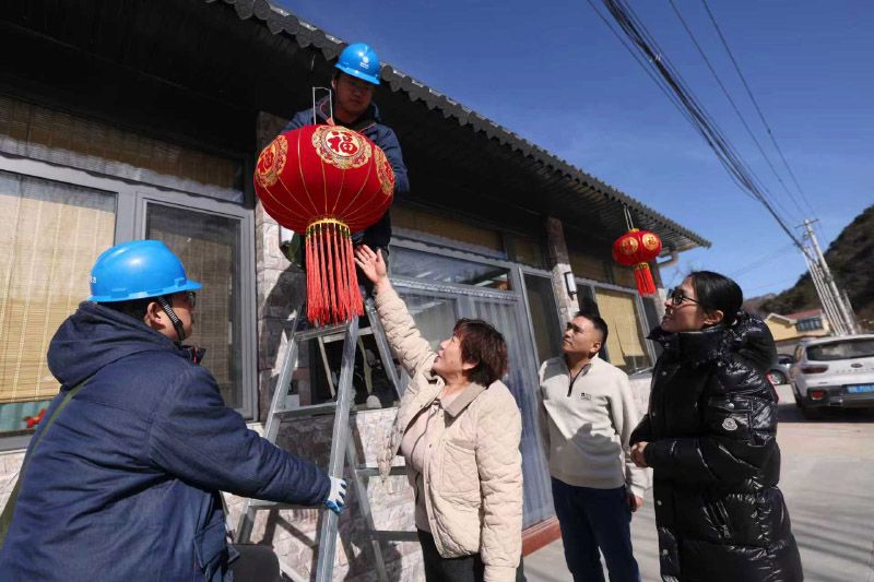 2月5日,密云区冯家峪镇石洞子村,国网北京密云供电公司冯家峪供电所工作人员张子航和卢欢为村民家挂上红灯笼。为做好春节供电保障工作,国网北京密云供电公司把暴雨受灾区作为重点,仔细梳理重建线路等设备设施情况,逐线、逐村编制“煤改电”供电保障“一线一案”“一村一案”。
