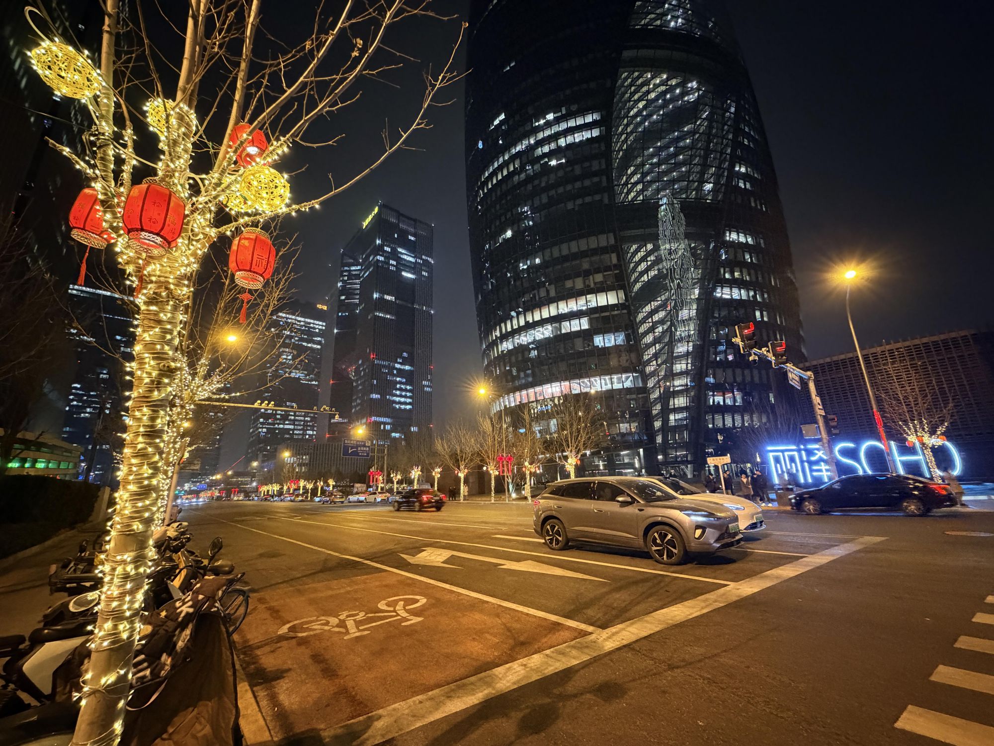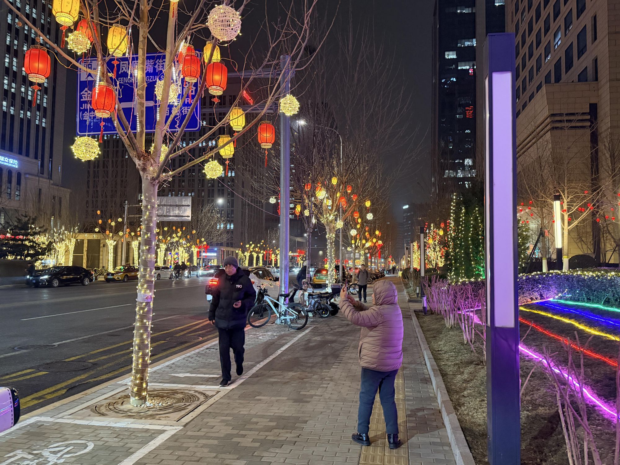 夜幕降临,丰台区丽泽商务区的主干道两侧,彩灯带缠绕枝头,红灯笼随风摇曳,璀璨光影将街巷勾勒得格外动人。“哇,整条街的灯都亮了,太漂亮了!”家住附近的李女士牵着孩子走出家门,眼前的美景让她忍不住赞叹,拿出手机记录下这浓浓年味。