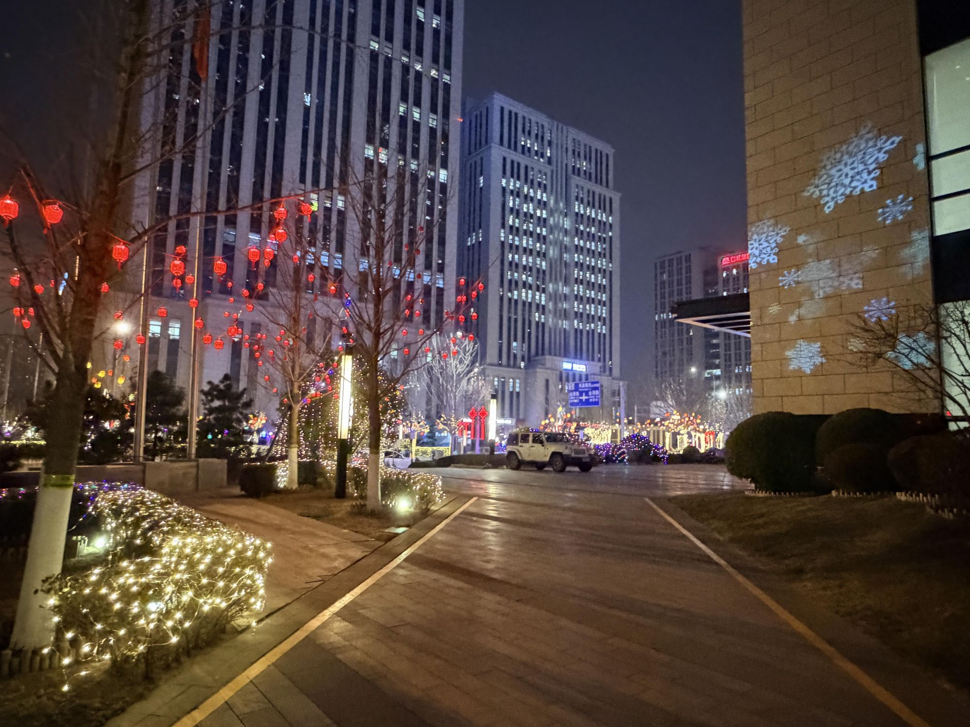 沿着凤凰嘴街前行,新春氛围感拉满。红色灯笼、中国结与五彩灯带沿行道树次第排布,白日里的一抹红韵,入夜后化作流动的光影。路旁楼宇的墙面上,“马年大吉”“雪花”等灯光投影,与枝头灯影交相辉映,不少市民专程前来拍照打卡。“往年就爱来丽泽看灯光,今年布置得更有新意,灯带绕着树枝像一串串发光的糖葫芦,走在这儿就像置身新春画卷里。”李女士边走边拍。