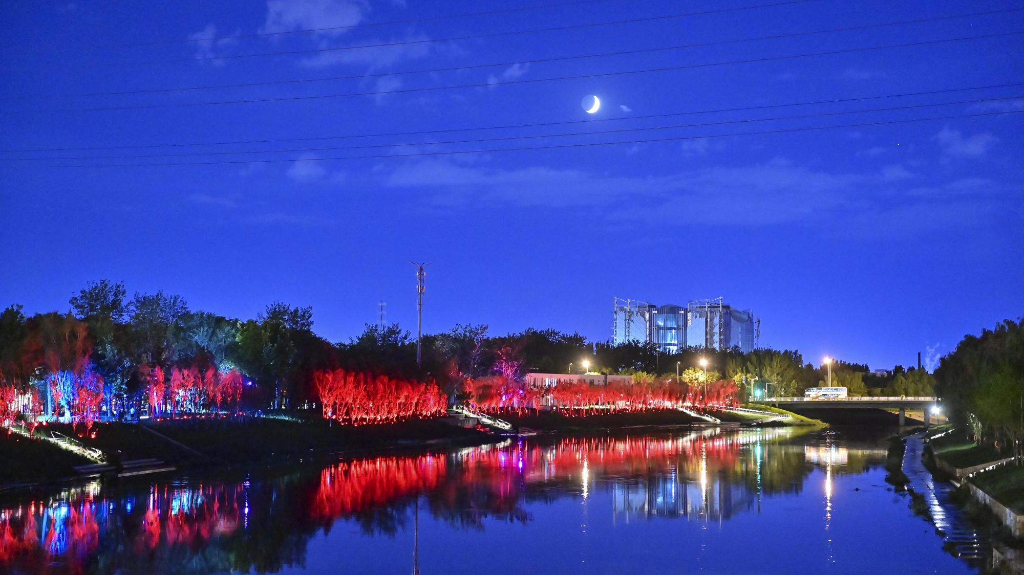 永定河、凉水河沿岸,春节期间也全面开启夜景照明。连贯的景观灯带沿着河岸延伸,灯光倒映在波光粼粼的水面上,灯影随水波轻轻晃动,绘就出一幅灵动的水岸夜景图。