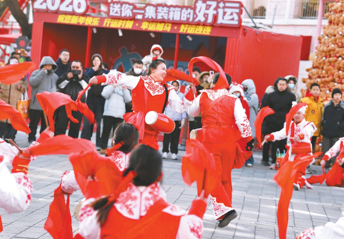 春节活动集非遗表演、光影艺术、特色美食、趣味互动于一体。文艺演出板块包含四大主题,全天将有21场精彩节目轮番上演:既有气势恢宏的非遗安塞腰鼓、年味浓郁的舞龙舞狮、绚丽夺目的“火龙钢花”;也有“时空穿越”主题花车与鱼灯巡游,巧妙融合国潮风尚与非遗韵味,摩天轮舞台还将持续献上中西荟萃的歌舞表演,更有全民参与的“新春蹦迪”环节点燃欢乐气氛。
