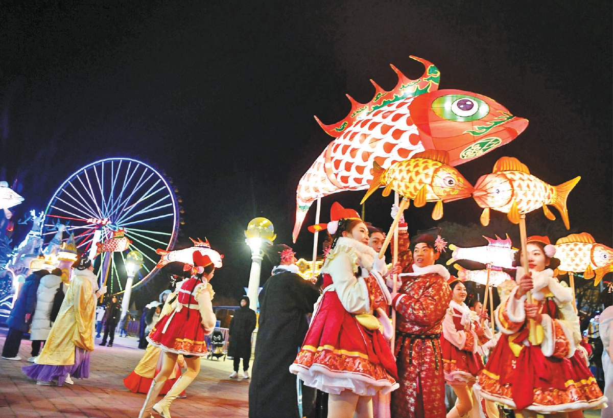 傍晚,游乐园内热闹非凡。火热的安塞腰鼓扭起来、欢腾的“骏马”舞起来、绚烂的火龙钢花亮起来,游客们在惊喜中提前感受了春节的热闹气息。六大主题灯组从神话传说到梦幻雪景涵盖多种主题,敖丙、十二生肖等灯组吸引了小朋友们的目光。