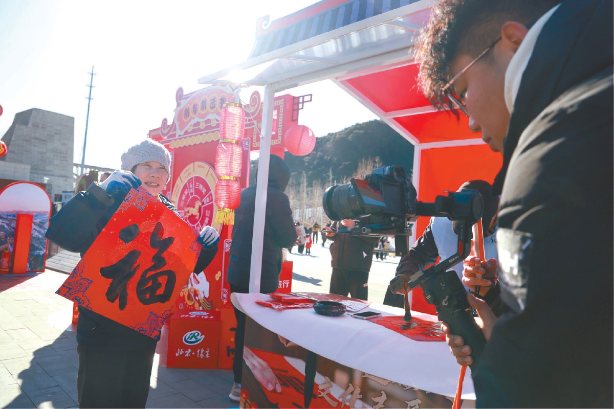 2月7日,慕田峪景区广场热闹非凡,正在举行的“来怀柔 过大年”京东年货大集上,近20个特色市集展位涵盖板栗糕点等美食、植物扎染等互动体验、怀柔特色文创产品,让年味直接拉满。市集中,文化志愿者们现场书写精美“福”字与春联,把新春祝愿送到市民游客手中。趣味互动环节,游客可参与打卡抽奖活动,体验投壶、翻转牌等游戏,大人小孩玩得尽兴,引得阵阵喝彩。