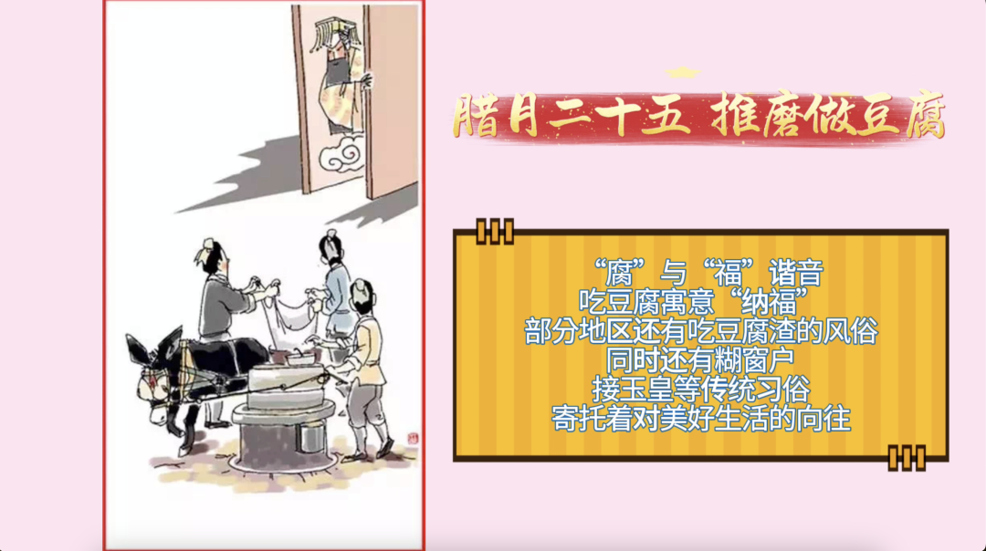 腊月二十五,推磨做豆腐。“腐”与“福”谐音,吃豆腐寓意“纳福”,部分地区还有吃豆腐渣的风俗,同时这天还有糊窗户、接玉皇等传统习俗,寄托着对美好生活的向往。