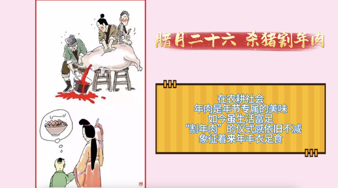 腊月二十六,杀猪割年肉。在农耕社会,年肉是年节专属的美味,如今虽生活富足,但“割年肉”的仪式感依旧不减,象征着来年丰衣足食。