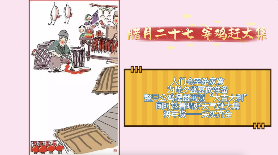 腊月二十七,宰鸡赶大集。人们会宰杀家禽,为除夕盛宴做准备,整只公鸡摆盘寓意“大吉大利”,同时趁着晴好天气赶大集,将年货一一采买齐全。