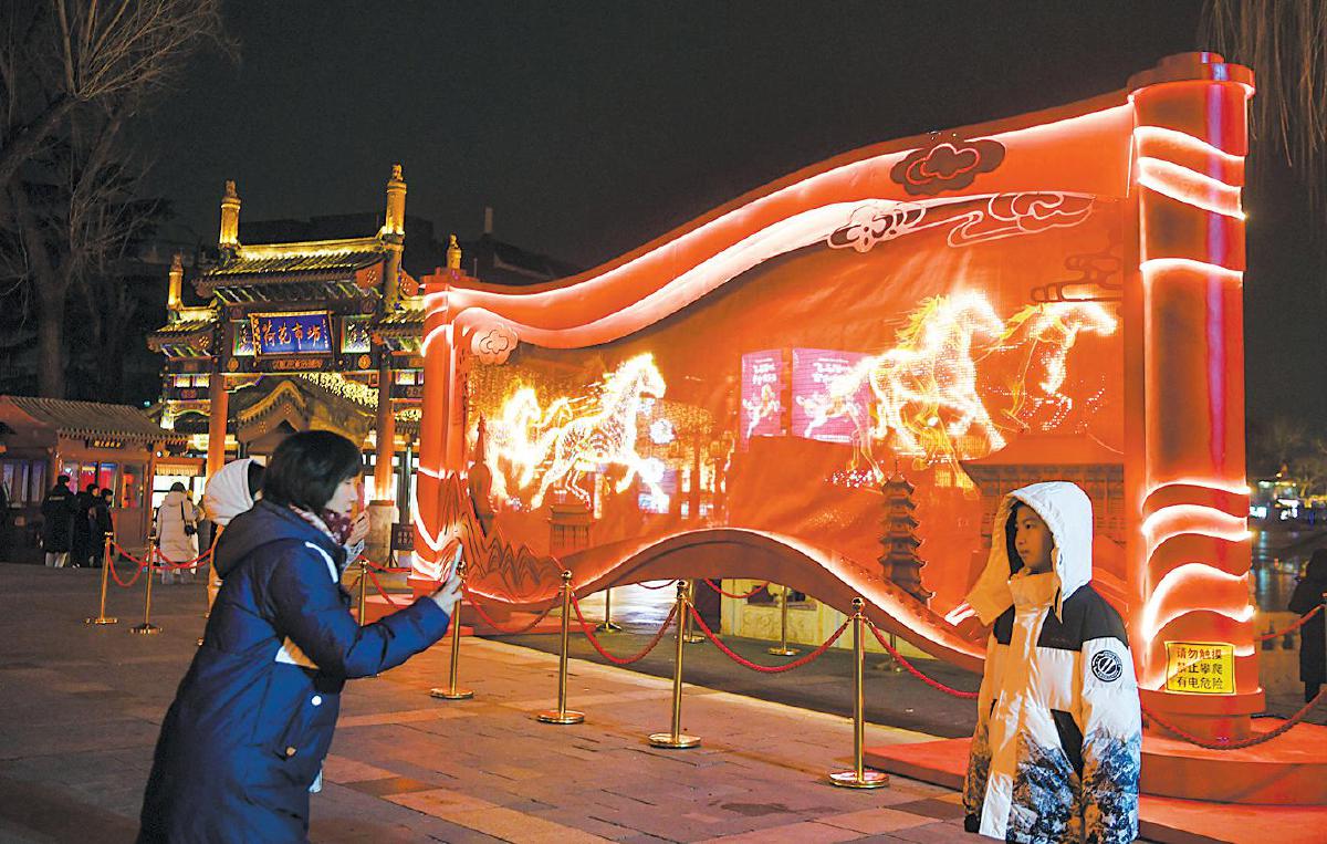 今年的春节景观布置紧扣马年生肖主题。昨晚在西单路口,市民刘女士拿出手机拍摄路边的景观小品,“我出门给孩子买过年的小礼物,看到这里有‘马’,感觉很有过年的氛围,有策马奔腾、蒸蒸日上的节日感。”刘女士说。此处景观小品名叫“万马奔腾”,以昂扬腾跃的骏马群像为核心,周边缀以新春灯笼等元素,吸引了不少市民拍照留念。家住承德的路女士告诉记者,她来北京探望孩子,散步时发现了这处景观小品,于是和老伴一起在“万马奔腾”前合影。