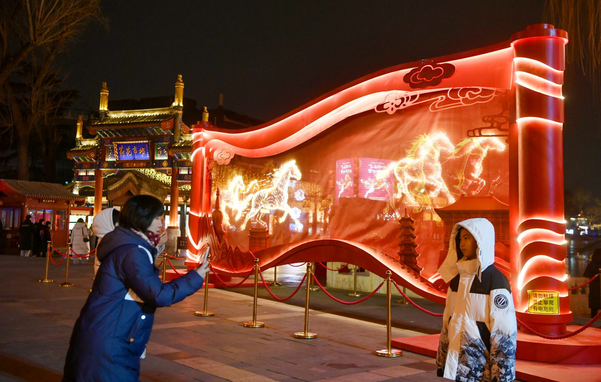 今年的春节景观布置紧扣马年生肖主题。今晚在西单路口,市民刘女士拿出手机拍摄路边的景观小品,“我出门给孩子买过年的小礼物,看到这里有‘马’,感觉很有过年的氛围,有策马奔腾、蒸蒸日上的节日感。”刘女士说。此处景观小品名叫“万马奔腾”,以昂扬腾跃的骏马群像为核心,周边缀以新春灯笼等元素,吸引了不少市民拍照留念。家住承德的路女士告诉记者,她来北京探望孩子,今天散步时发现了这处景观小品,于是和老伴一起在“万马奔腾”前合影。