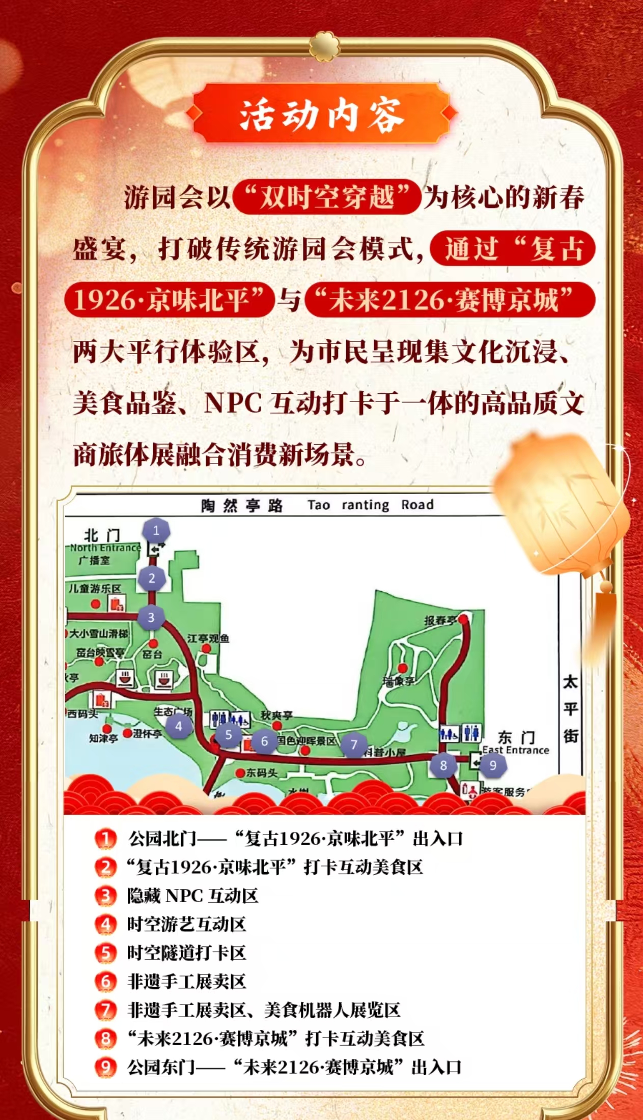 “马上开宴·时空食光局——2026北京餐饮年货节·陶然亭游园会”将于2月17日(农历正月初一)至2月21日(农历正月初五)在陶然亭公园北门广场、东门广场及东门至北门沿线启幕。