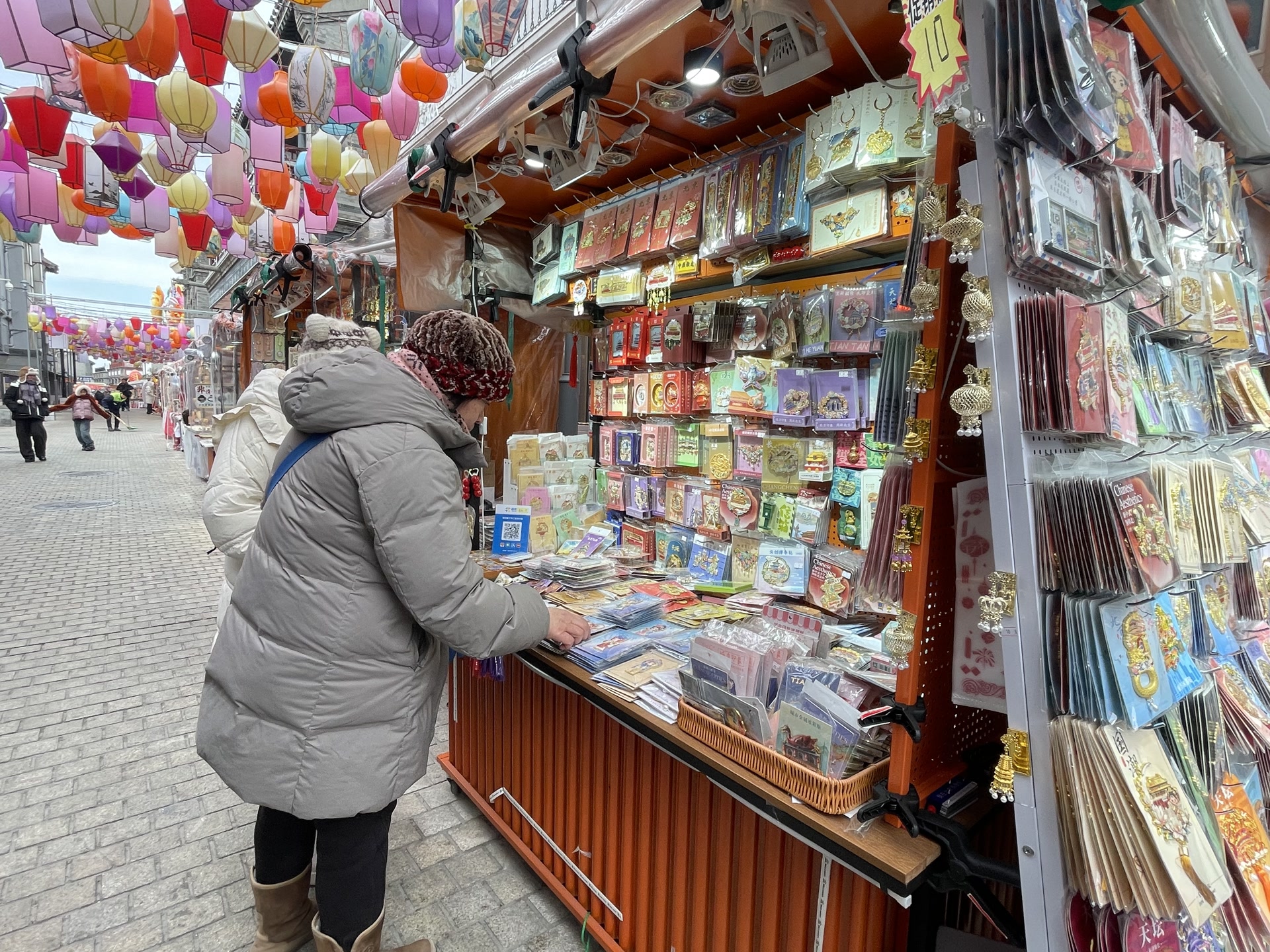 不同于传统大集,节前各大景区、商圈内,文创、潮玩、美食主题的市集扎堆亮相,年轻群体成为消费主力军。在前门广和楼前的胡同里,青砖黛瓦与彩色灯笼相映成趣,文创市集整齐排布。临近胡同口,相邻的两个冰箱贴摊位人气最旺,是市集里的“流量担当”。