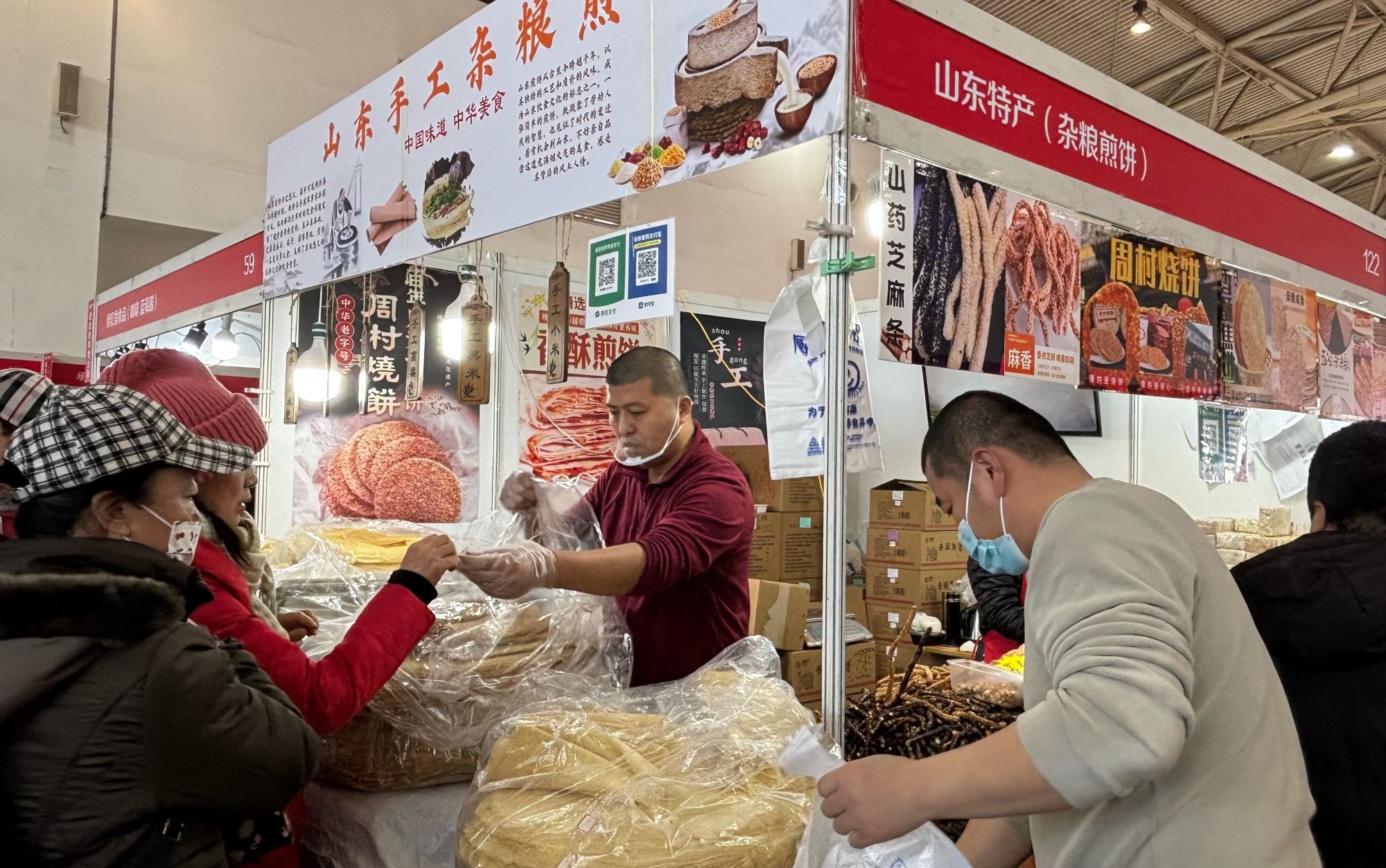 “这都是咱老家特产。淄博烧烤你肯定知道呀,用它卷点儿肉,卷点儿大葱。”一个售卖山东手工杂粮煎饼的摊位前,小米、糙米、黑米等煎饼各自垒成硕大的圆柱形。摊主是一对兄弟,弟弟小杨介绍,他们已参加了十多年大集。“我们在老家有作坊,哪种快要卖完了,就打电话从老家发过来。这么一大包是五六十斤,每天能卖两三包。”