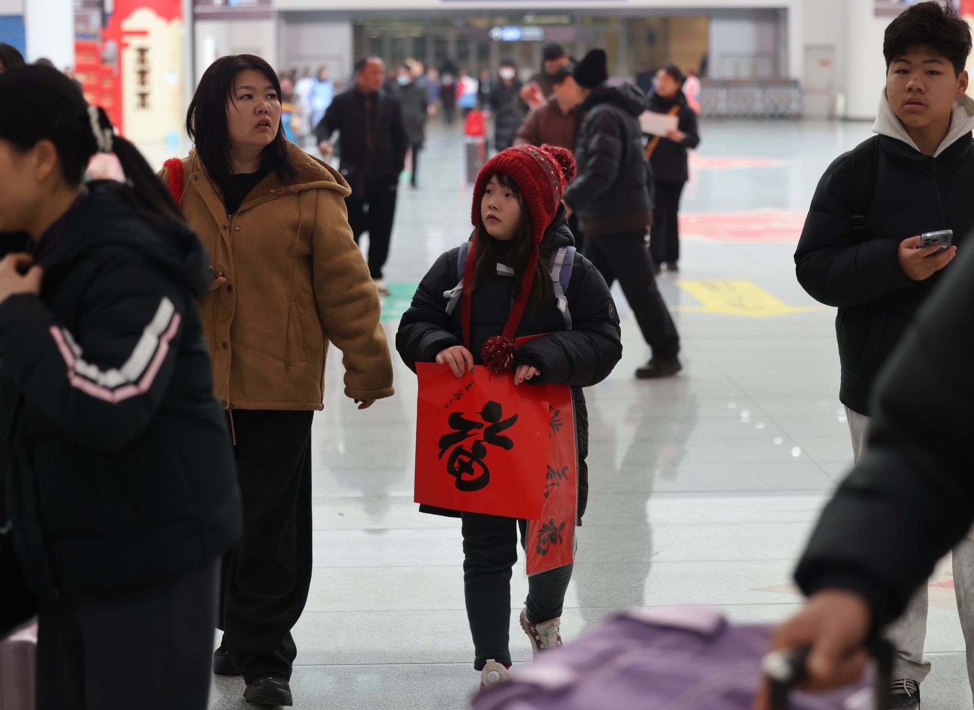 旅客拿着福字和春联踏上回家旅程。新京报记者 王贵彬 摄