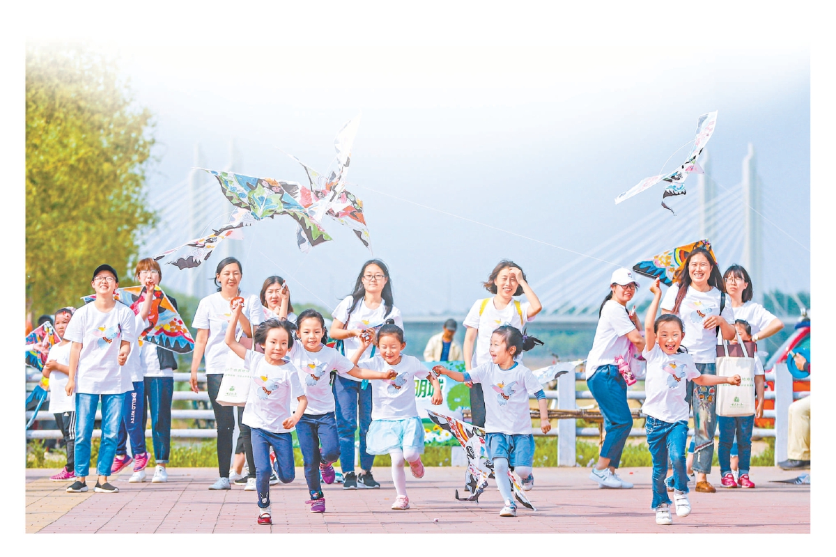 顺义潮白河畔,小朋友放飞风筝,尽情享受美好环境。 本报记者 武亦彬摄