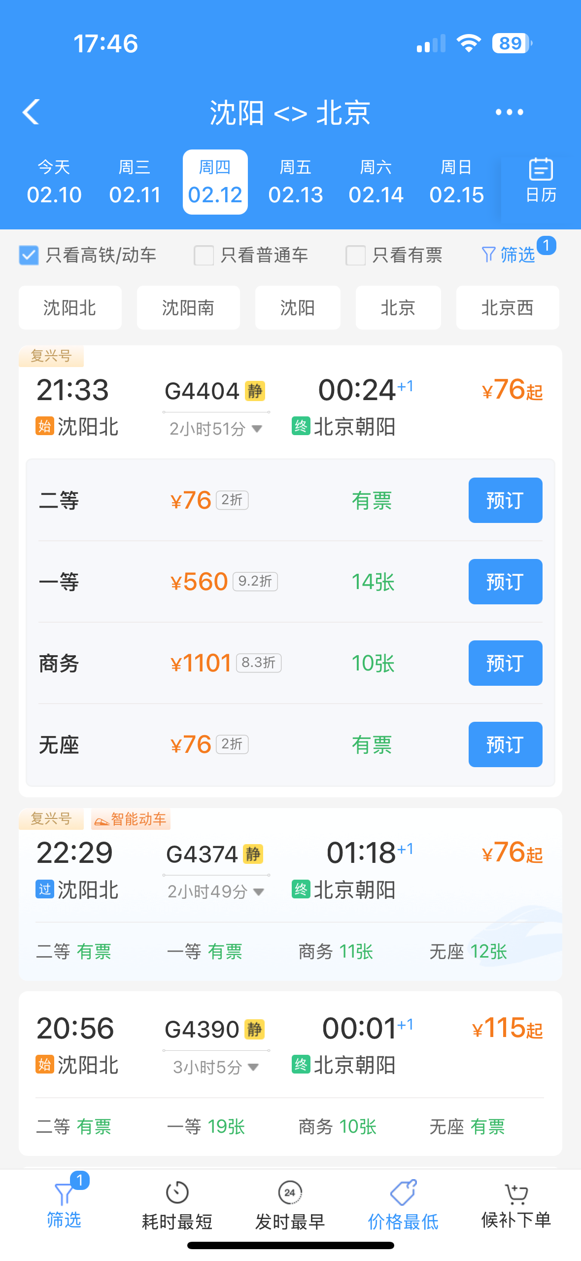 2月12日,从沈阳北站到北京朝阳站的多趟高铁列车执行优惠折扣票价,最高折扣为2折。 铁路12306App截图