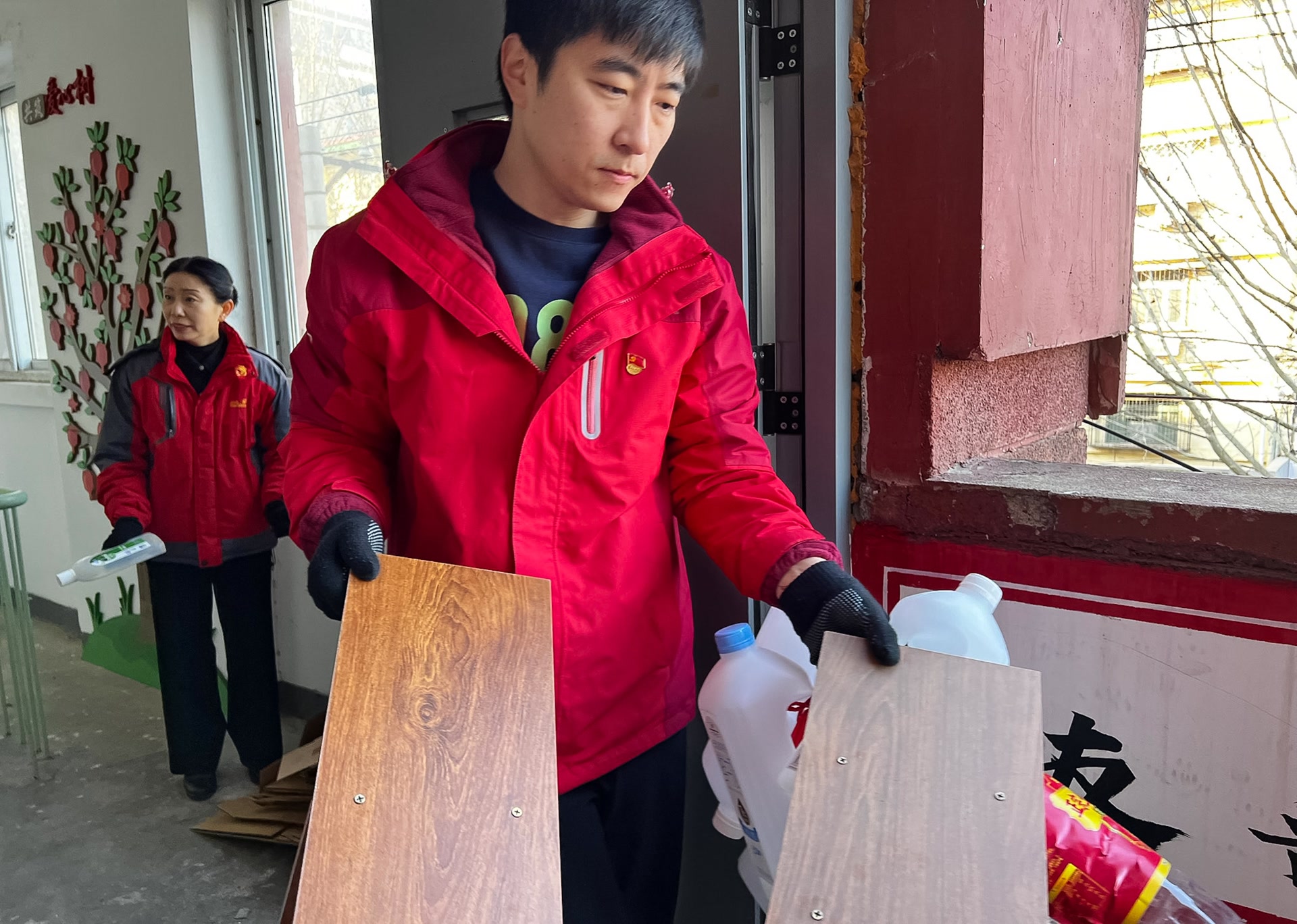 楼道内,一张落满厚厚尘土的小桌子显然已被“遗弃”多时,桌下还堆放着成摞的纸板、纸箱等可回收垃圾。“有的居民会将瓶瓶罐罐、快递纸箱等可回收垃圾暂存在楼道里,楼道公共区域有时候还会堆放一些大件无主垃圾,既破坏环境卫生,还有安全隐患。”核桃园社区党委书记潘瑞凤招呼大家,“楼下就有可回收物的收集箱,大家帮忙把这些东西搬到楼下吧!”或搬或抬,或拎或抱,没一会工夫,志愿者们就将堆放在楼内的垃圾清理一空,并将楼道地面用扫帚清扫干净。