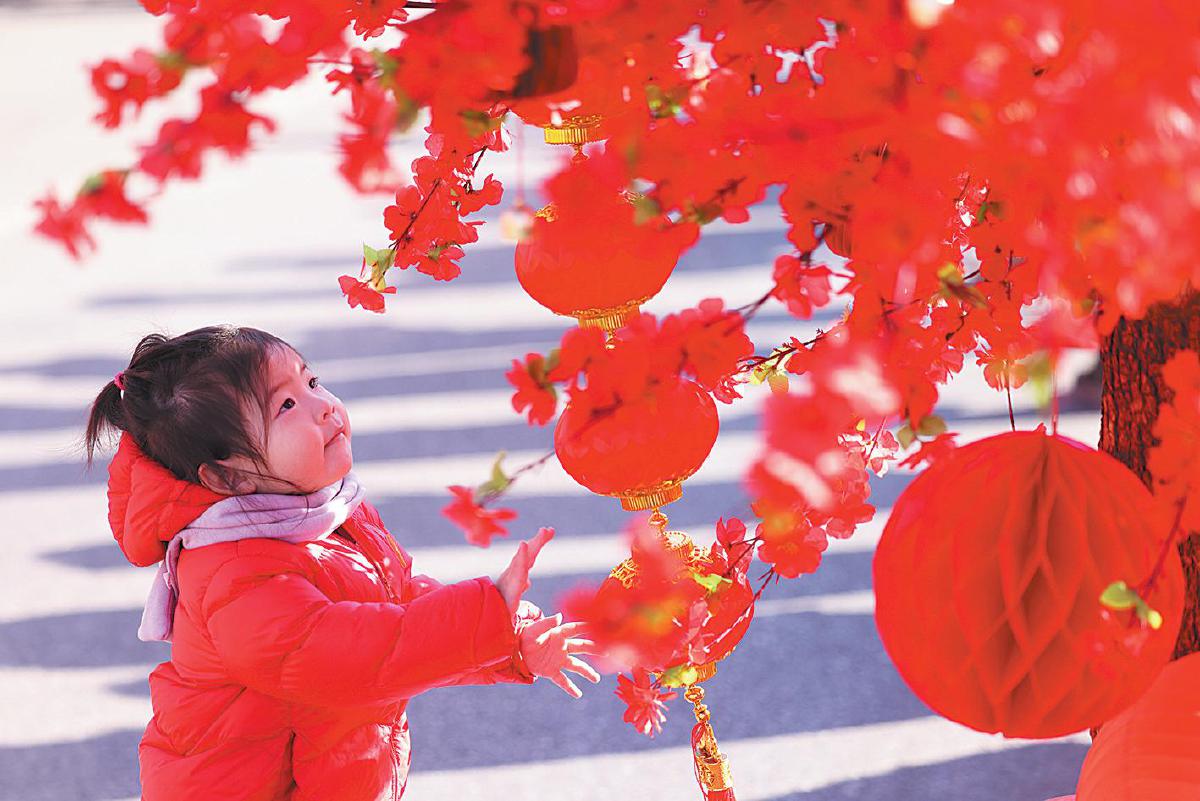 场景:年货市集,身穿红衣的小姑娘触摸着红彤彤的绢花灯饰。
