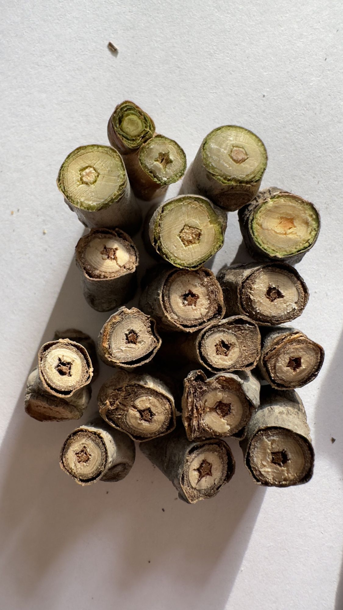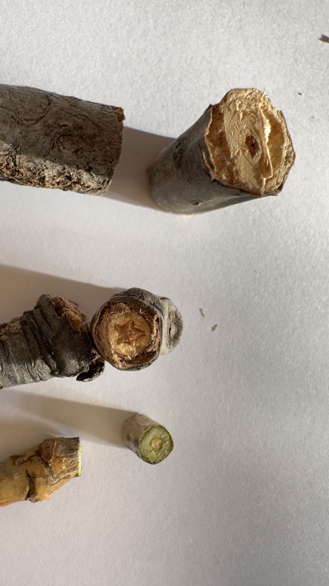 为何有些枝条剪开后没有星星图案?她说,2-4年生半干枯枝条,横截面有星星图案的可能性更大。因为在一段时间内,枝条木质部快速增粗时对髓心产生均匀径向挤压,使五棱结构更规整。同时,木射线细胞沿五轴方向有序排列,强化五角星轮廓。