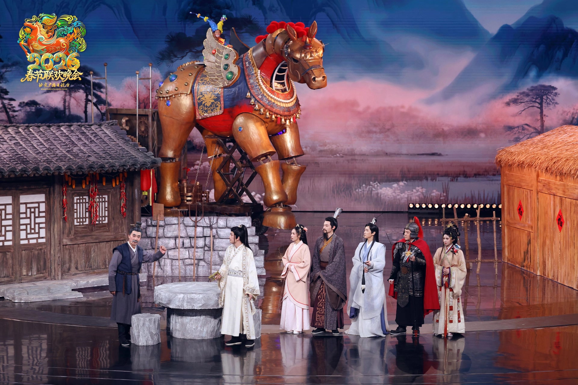 整场晚会的语言类节目中,有映照时代现实的温情作品,如蔡国庆、大锁、范明、刘奕铁、王宁主演的《塞翁又失马》,让塞翁丢掉的不是马,是流量时代的体面,所有蹭流量的姿势都成了寓言新编里的诙谐注脚。郭甲醛、孔令美、于莎莎演绎的《年终大奖》,将年会大奖变作一场与老板同行的尴尬之旅,在分寸的试探与善意的回锋中,写下献给职场人的柔软映照。