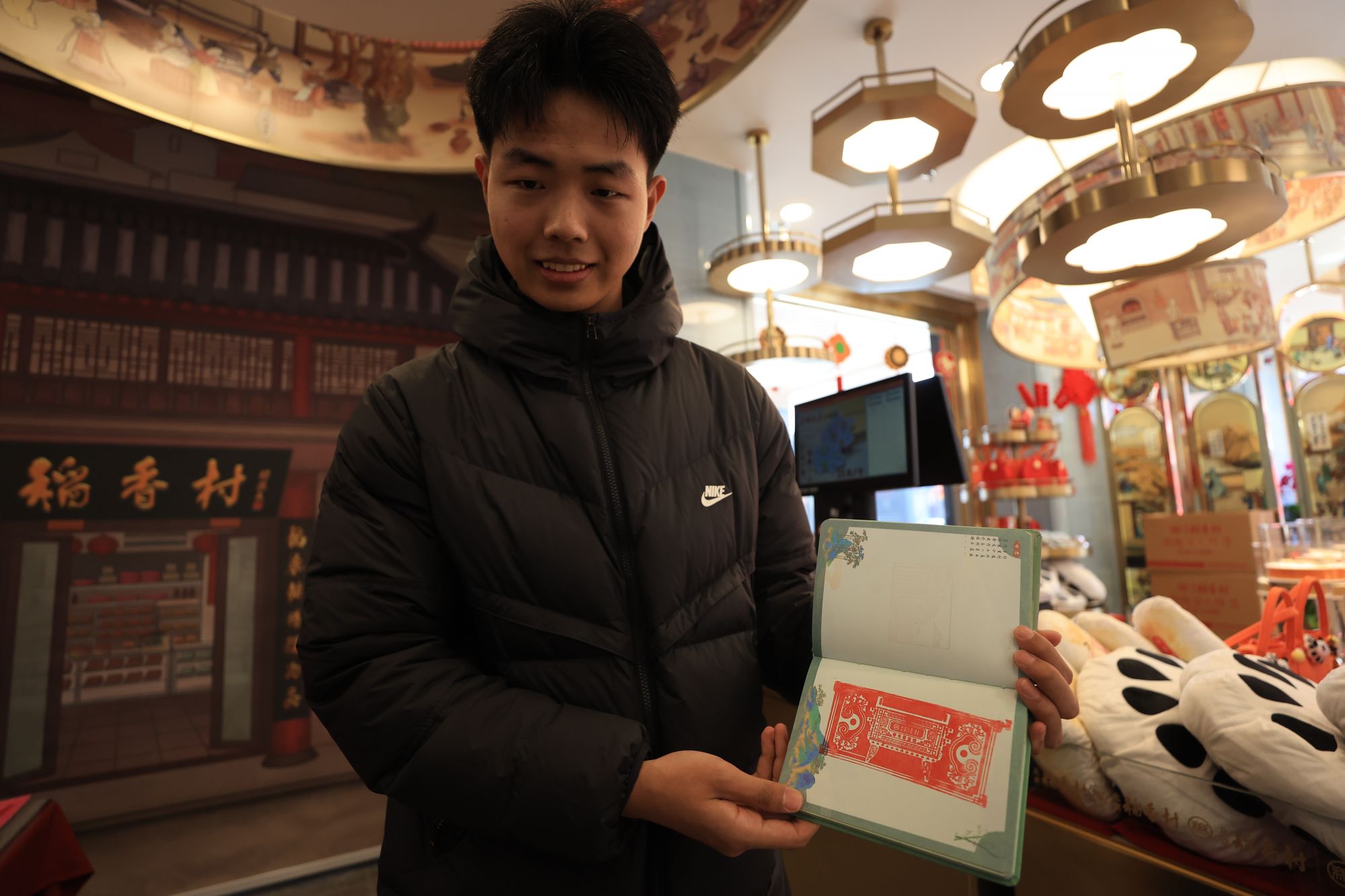 来北京旅游的辽宁小伙儿孟芯延说,今天就准备启程回家过年了,出发前专门来稻香村买了“三件套”带回老家。他还拿出笔记本,让店员帮他集章打卡。