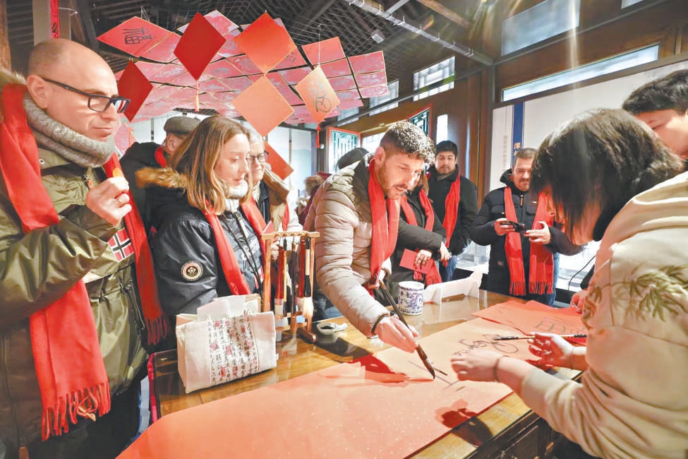 在书法体验区,外国游客书写福字和英文趣味春联,在笔墨流转中感受中国书法的独特韵味。 本报记者 程功摄