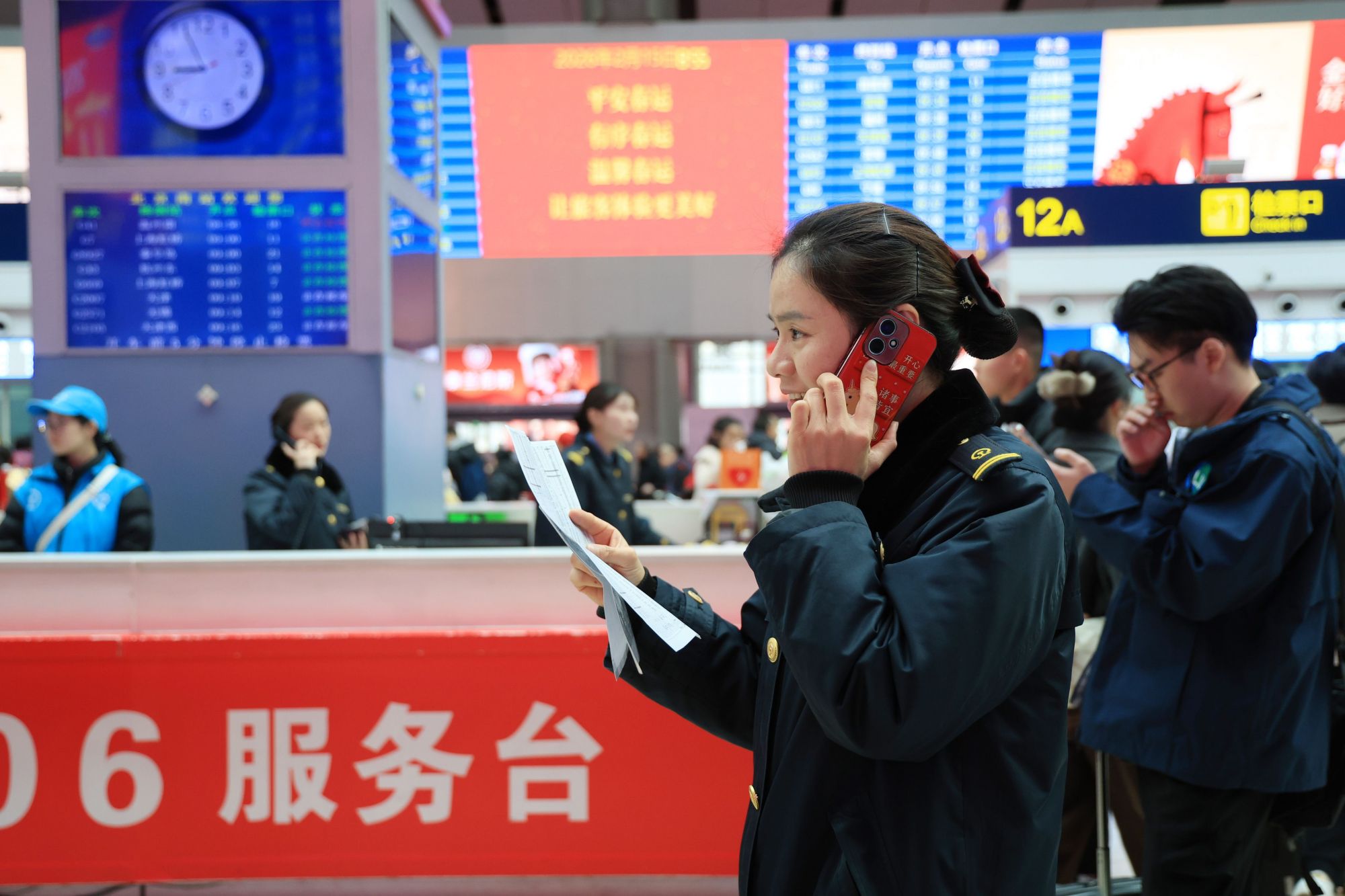 今年是她经历的第13个春运。谈起变化,她的感受很具体:车次更密了,间隔更短了。“客流量大,又非常集中。”10点前后,北京南站的10号到13号检票口最忙碌,有两趟同台列车的发车时间仅隔三分钟。像开往青岛的G1063次和开往南昌西的G811次,间隔也只有六分钟。这意味着,第一趟车的检票还没结束,第二趟车的检票可能就要开始了。李玲必须在现场及时协调处置,不断提醒、分流,确保旅客们不乱,更不能上错车。