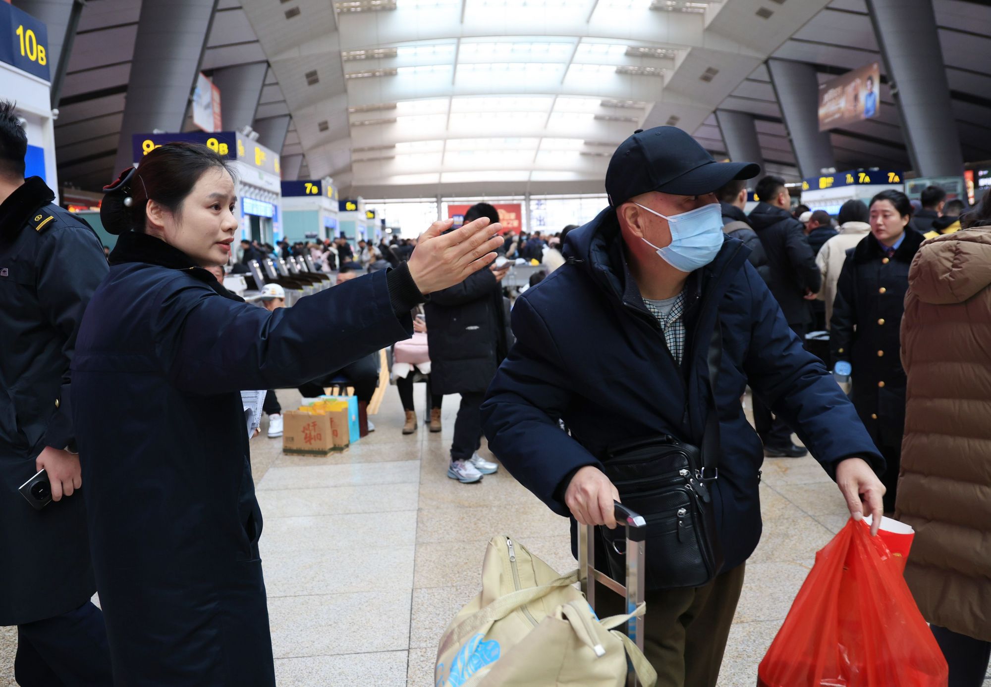 今天上午,北京南站继续迎来大客流,李玲为旅客指引检票口方向。新京报记者 王远征 摄