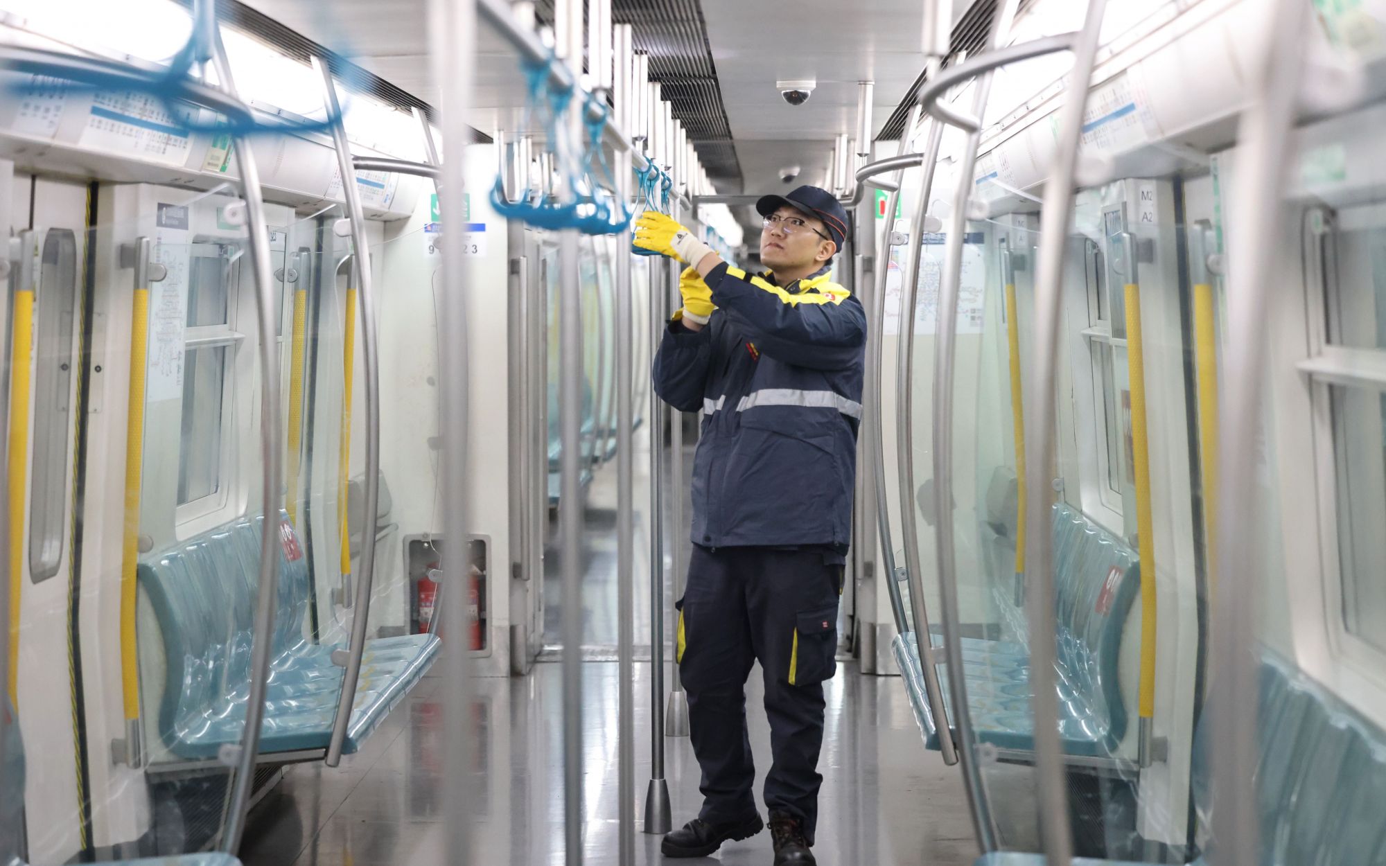 完成车底作业,李易登上车厢。这里的工作直接关乎乘客的体验和安全。他用力拽了拽客室里的扶手杆,又逐个检查了吊环拉手,确保没有松动迹象。“这些都是乘客直接接触的地方,一点也不能马虎。”