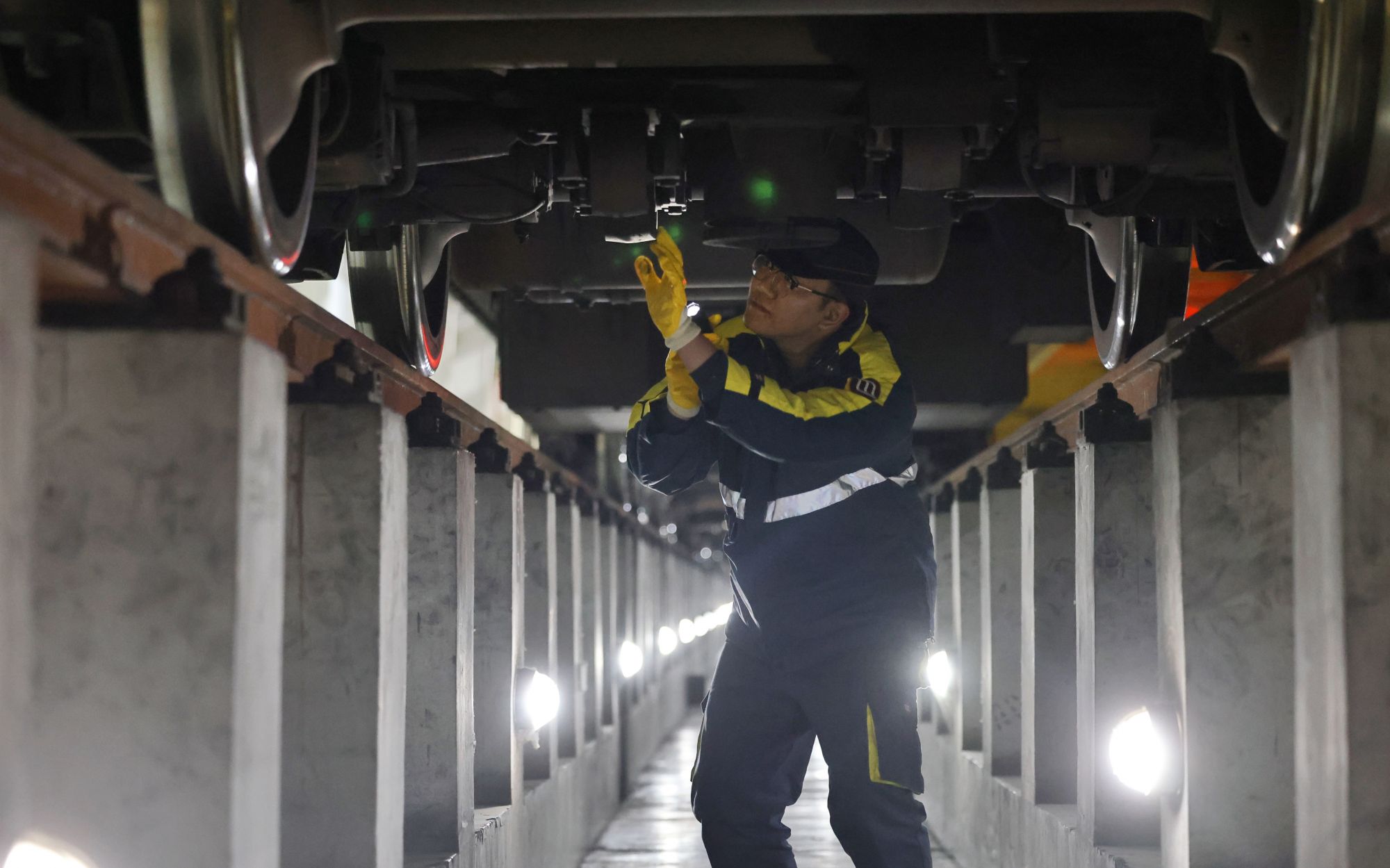 车底是当夜检修的第一站。检修地沟空间狭小,高度约1.8米,宽度不足1米。李易需要手持强光手电,并时常切换为弯腰、侧身、半蹲等姿势,在局促的空间内检查走行部、风源系统、制动系统、受流器等关键部件。