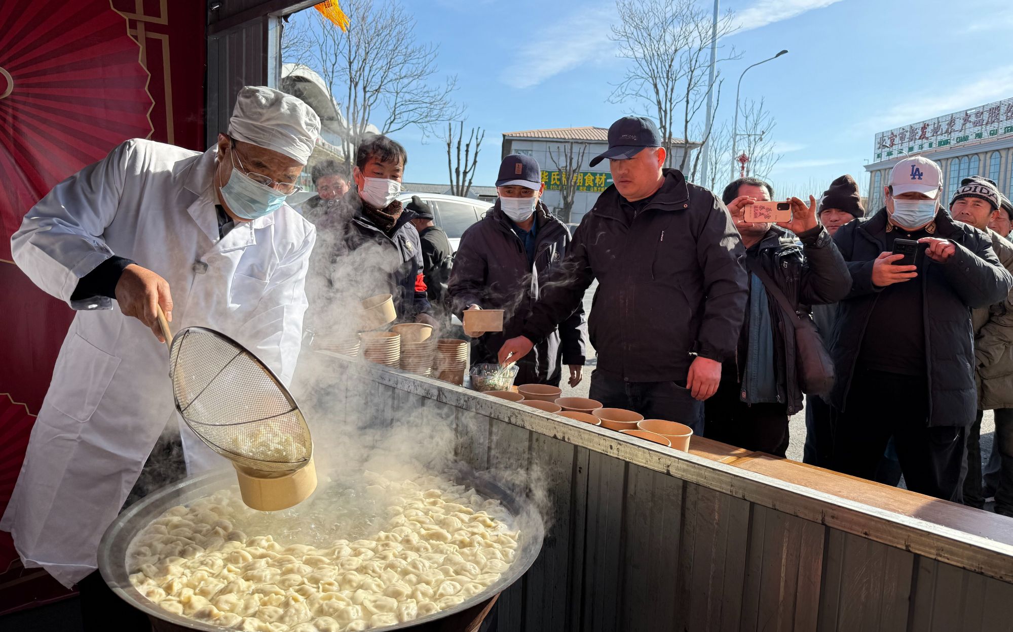 随着两口大锅里的水沸腾,像往年一样,张玉玺换上白大褂,戴上帽子和口罩,现场为留守商户煮饺子。商户在饺子屋前排起了队,等候品尝除夕饺子。