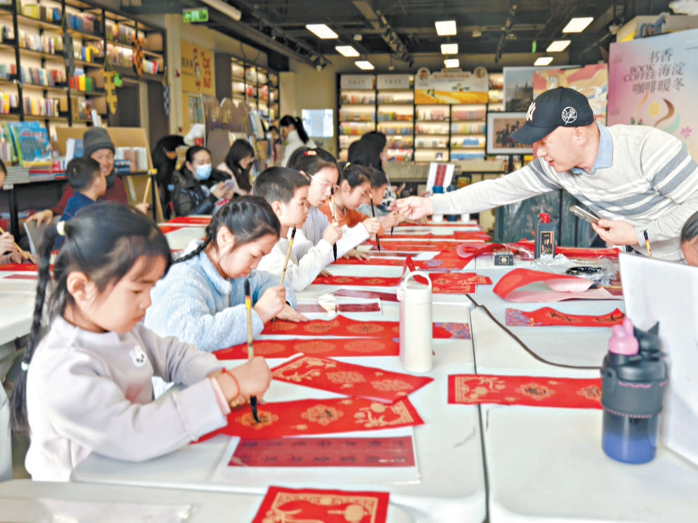 小朋友在中关村图书大厦体验写春联。