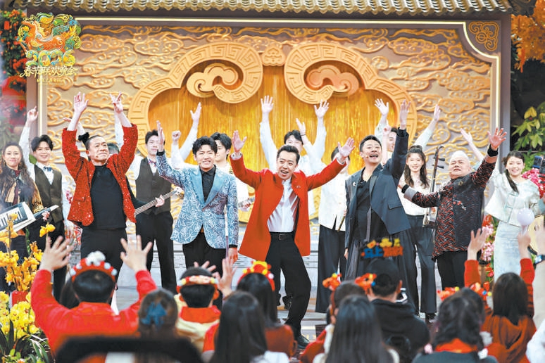 语言类节目同样充满巧思创意,大胆融合多元元素,拓展喜剧边界,实现形式与内容的双重创新。方锦龙、李涵、李菁、梁龙、印小天联袂打造的《策马迎春》以群口相声融合国乐、摇滚、舞蹈等多种艺术形式,琵琶的千年国风、摇滚的现代节奏与网络的热梗脉搏相遇,宛如一场跨越时空的才艺雅集。趣味互动《春节动起来》由合文俊、瘦不了、悦悦活力演绎,巧妙结合“全网催合文俊出歌”的网络热点,将简单易行的健康动作融入旋律,让春晚在“刀马”手势与模拟小马抬腿的趣味节拍中,真正地“动”起来。