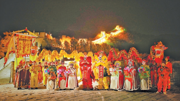 除夕夜,北京八达岭夜长城如约与游客见面。暮色四合,千盏灯火沿城墙次第点亮,宛如金龙苏醒。城下,锣鼓声里,旱船飘逸、竹马奔放、彩龙腾跃,喜庆年味扑面而来。