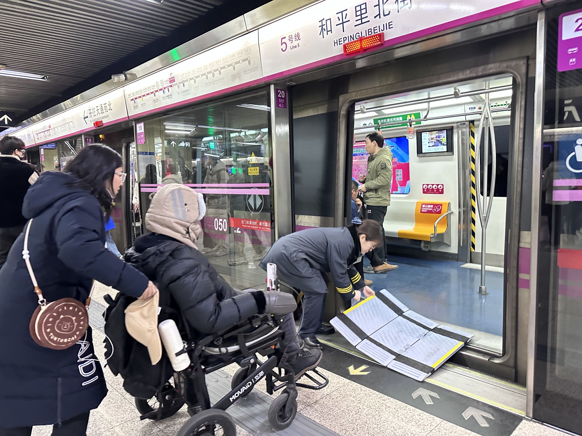 “您别着急,咱们通过无障碍平台进站”“这个设备下降会比较慢,您不用担心安全问题”,上午11点,站务员闵宁在服务常规客流的同时,也时刻关注着特殊乘客的需要。今天上午,接连有乘坐轮椅的乘客进出车站,闵宁和同事便全程护送,利用无障碍平台平稳接力。