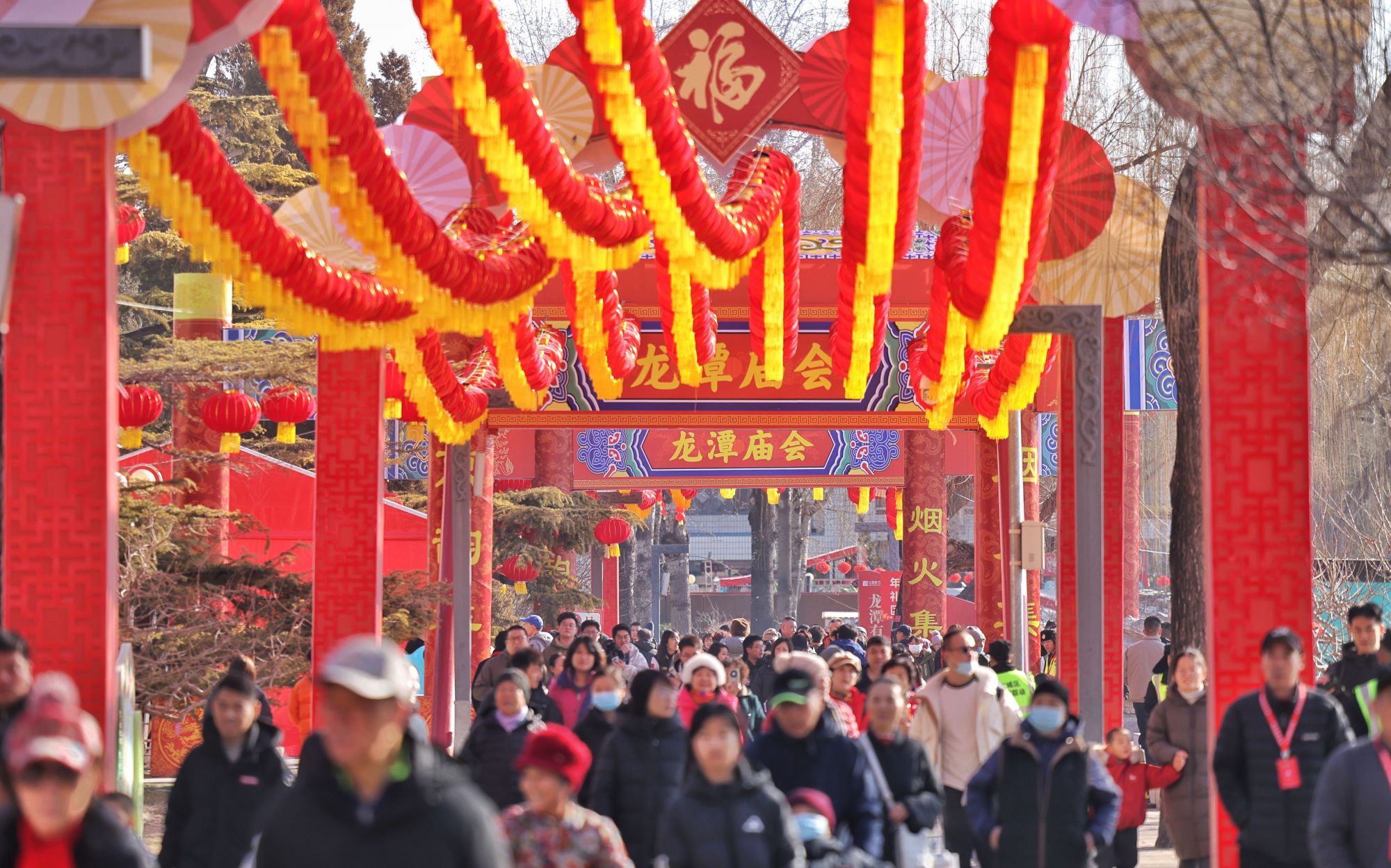 记者了解到,第四十届龙潭春节文化庙会将持续到2月23日(农历正月初七),每日8:30-17:00开放。行走在园内,舞台上的表演、路两旁的各种摊位吸引游人关注,大家忙着选购商品、参与游戏、品尝小吃。