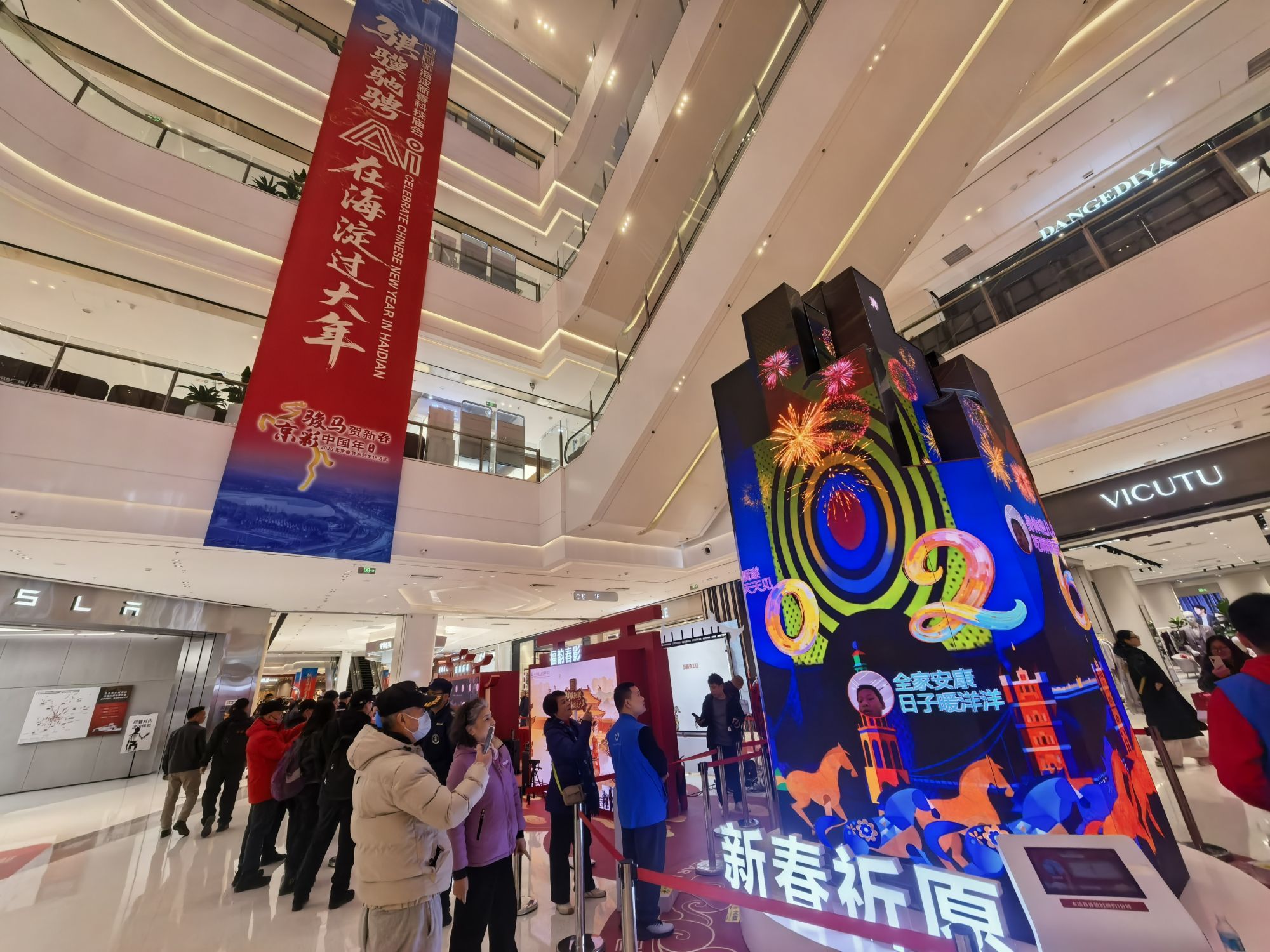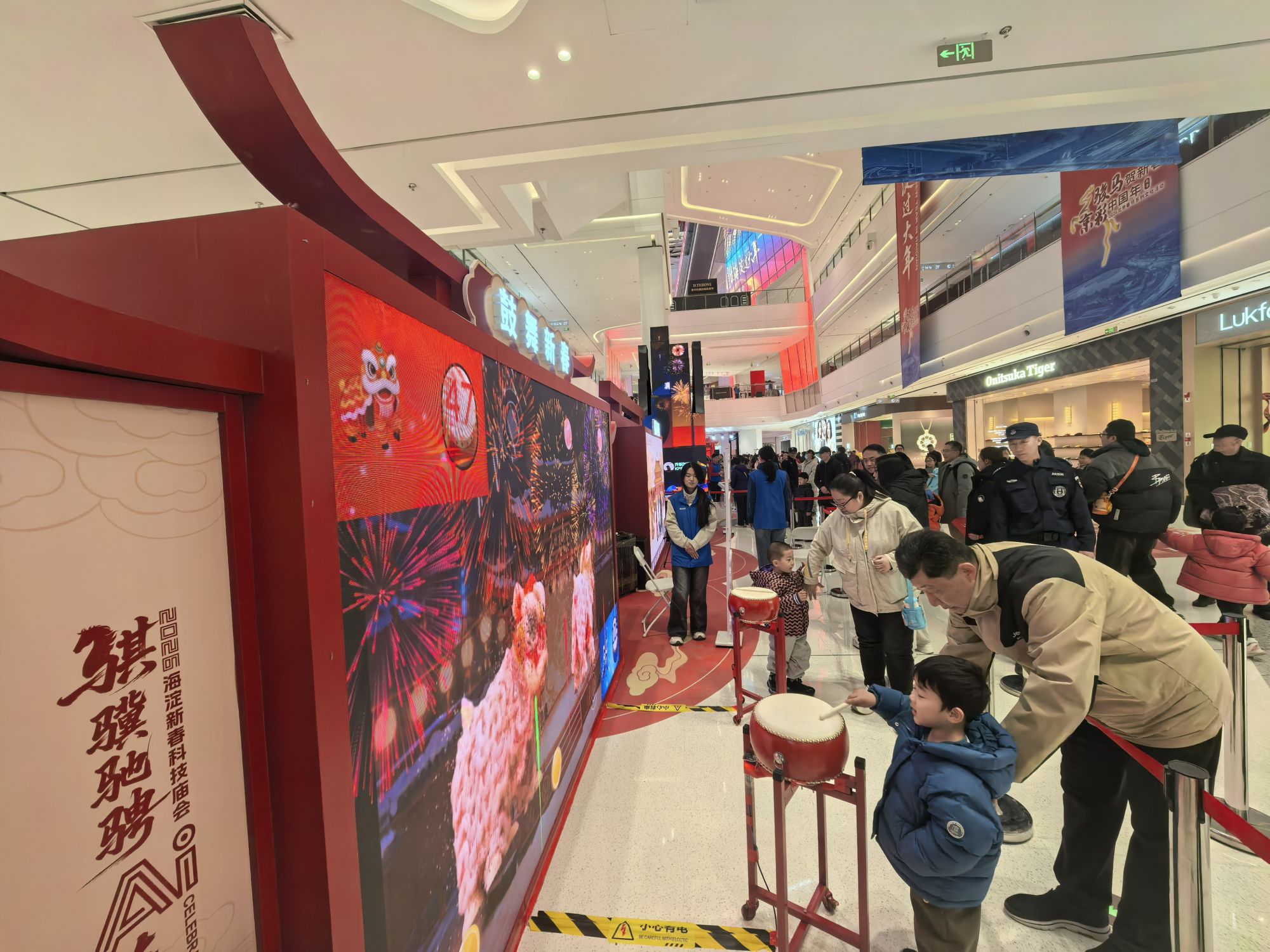 作为海淀科创实力的全景秀场,科技庙会联动五棵松万达广场1-6层消费场景精心布局五大特色展区,免费向公众开放。全方位打造“年俗文化+科技体验+未来生活”三大生态内容。庙会现场集结43项具身机器人展项,其中34项人形机器人展项,还有多项AI大模型、数字人、VR、AIGC等精彩前沿科技互动体验,AI芯片塔尽显海淀智造的硬核实力与创新魅力。