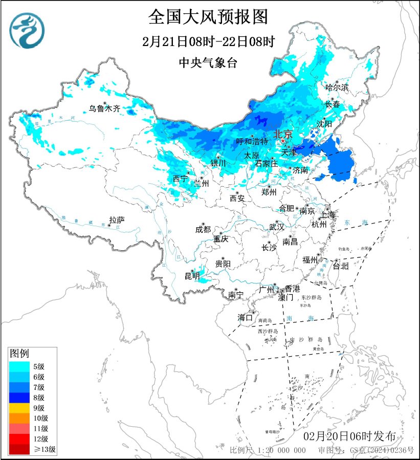 中央气象台2月20日06时继续发布大风蓝色预警: