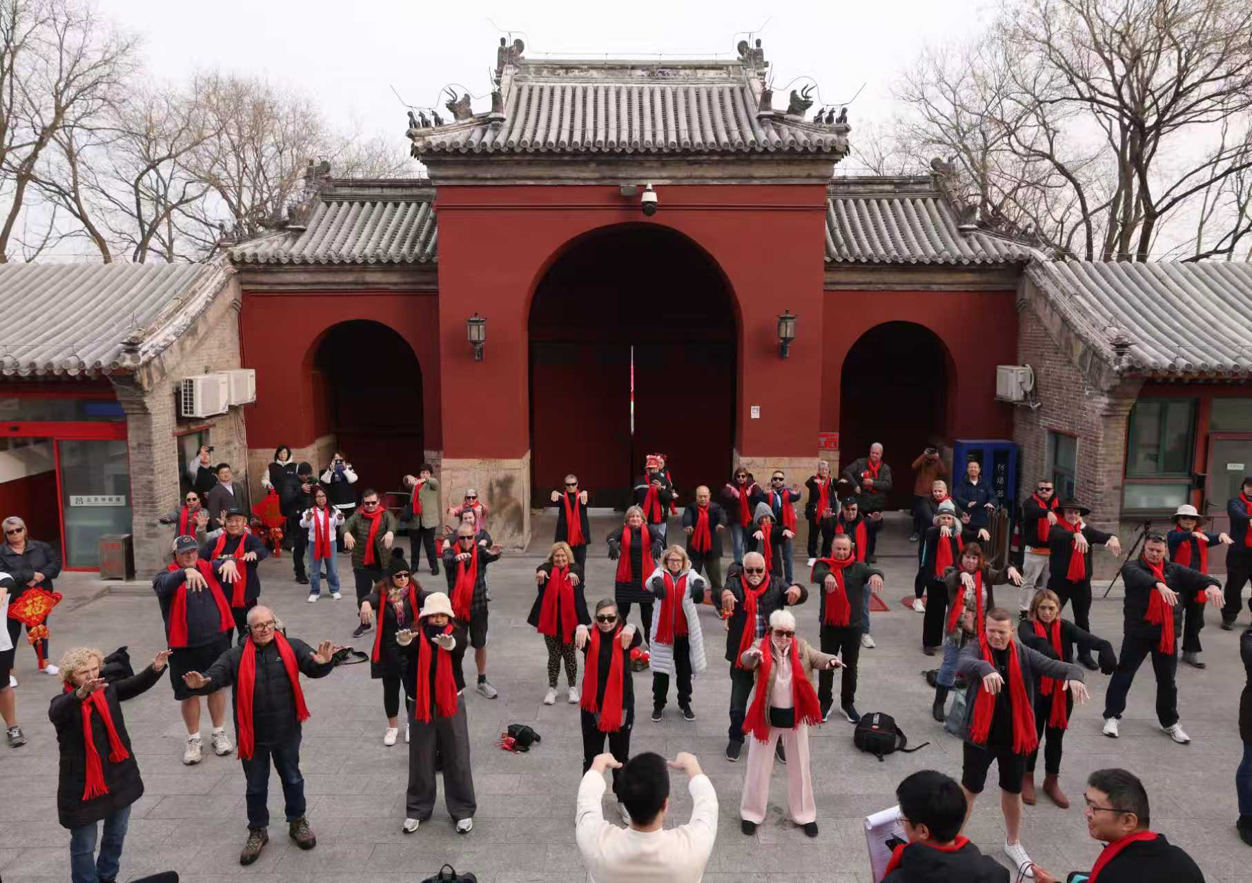 欢迎仪式由太极表演拉开序幕,表演者高崇焱刚柔并济的动作,引得澳洲游客纷纷驻足跟学,一招一式,打得有模有样。北京市文旅局局长郭怀刚用英语为澳洲游客送上新春祝福。他表示,钟鼓楼的千年钟鼓穿越时光,北京正以最开放的姿态、最优质的服务,邀全球游客共赏中轴线的恢弘壮美,品味老北京胡同文化。